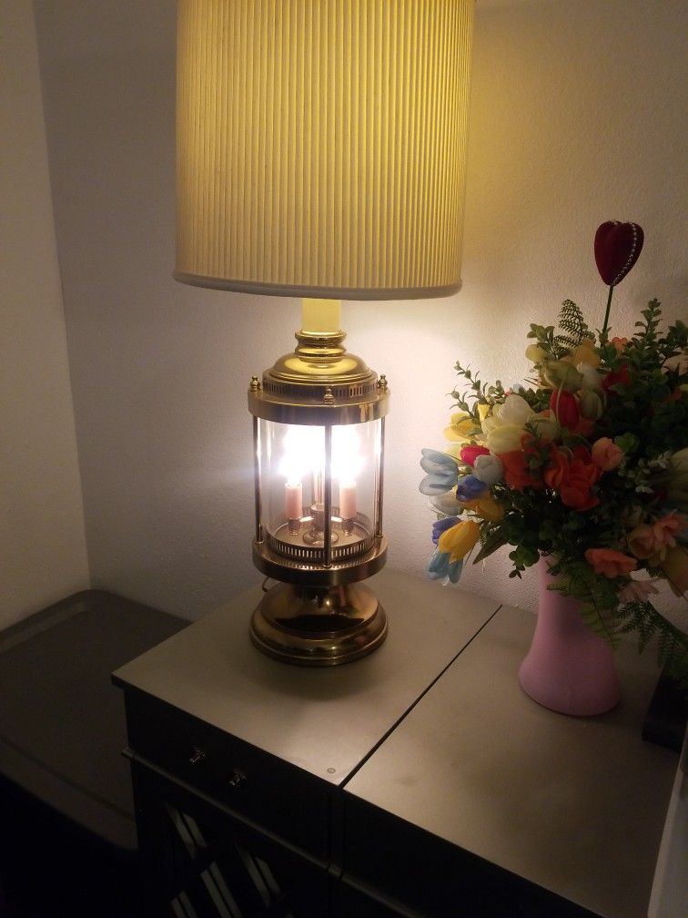 Huge Mid Century Walnut Brass and Glass Table Lamps / Lighted Base / Beveled Glass Panels, good condition, works, we're changing the style of the living room have no use for it.