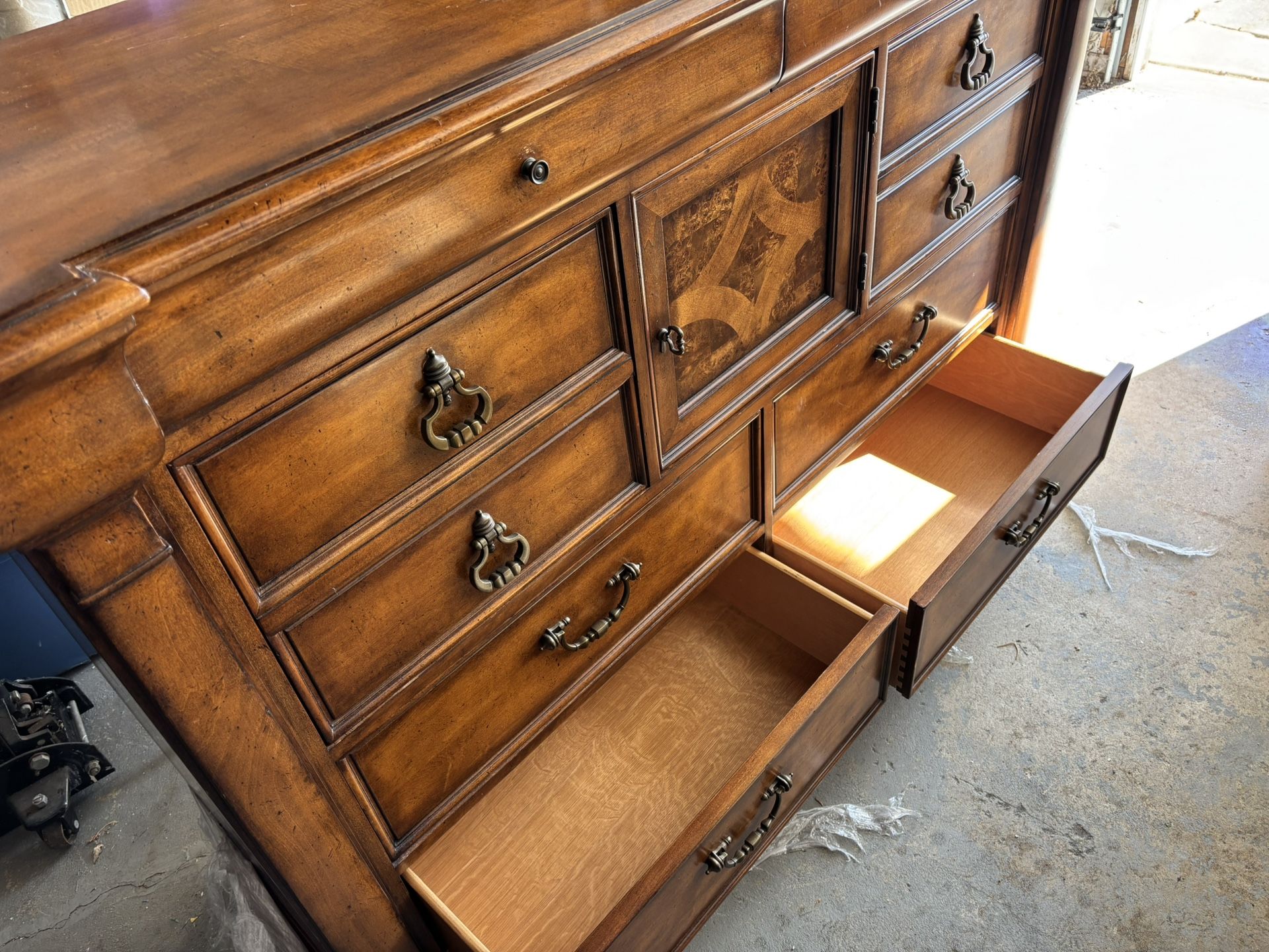 Extremely sturdy known Thomasville Chest with a beautiful front inlay on the door. 64” Long/ 20” Wide/ 45” Tall. Easy access in garage/ no delivery. Needs to be cleaned with a little TLC. Some scratches on top from television but easy touch up.