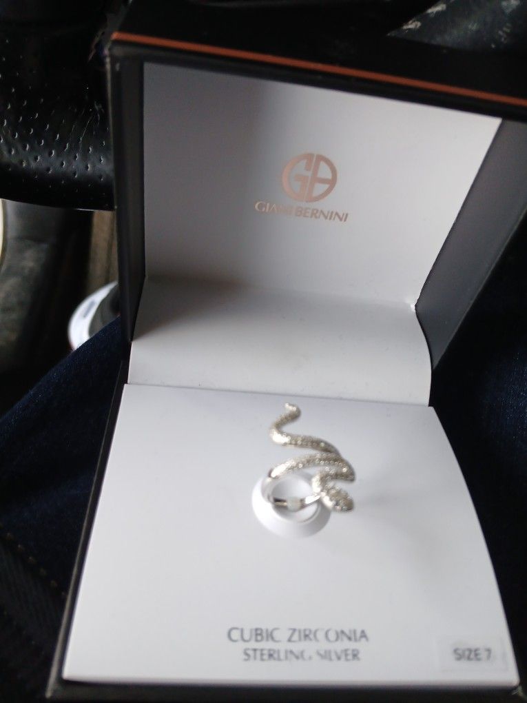 Beautiful size 7 snake ring recently bought at Macy's for $135 + tax. It is Sterling silver with cubic zirconia. It also states real opal but I must be blind. Perfect gift for the lady on Valentine's Day. I broke up with my girlfriend and this was going to be her present. Willing to take a small loss to get rid of it. Did not purchase any insurance plan with it. A hundred bucks firm. No tax!