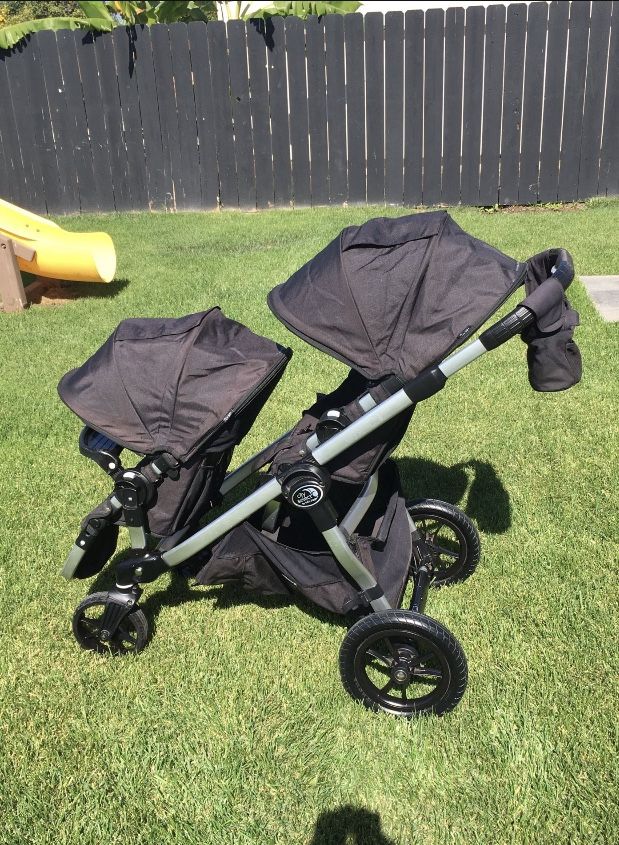 City Select Double Stroller. Includes: two seats, one food tray, drink holder, and infant car seat attachment. Will deliver for additional fee.