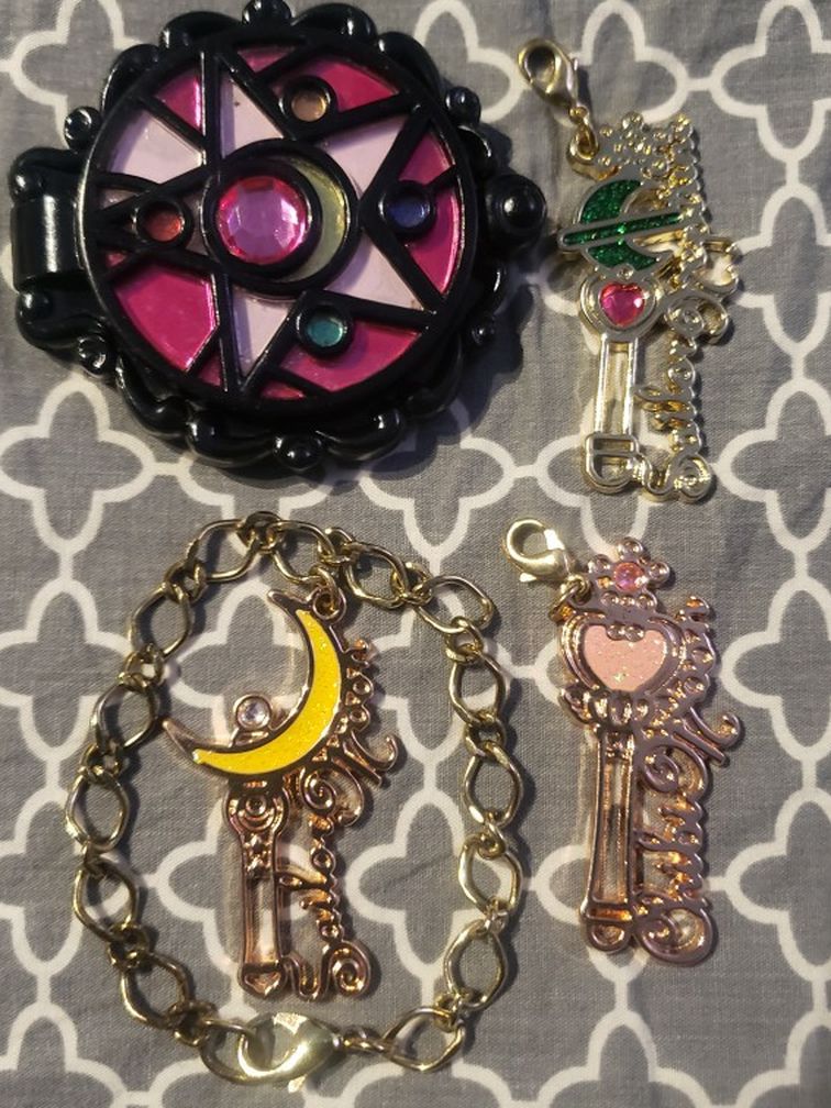 Selling as a set (No splitting) Authentic/ officially licensed Sailor Moon accessories. All items came from a Japanese gashapon machine. The Sailor Moon charms bracelet seems to be made of metal (idk what type), and comes with 3 charms: Sailor neptune, Sailor chibi moon, and Sailor moon. The Sailor moon charm came pre-attached to the bracelet and doesn't come with a clasp, while the other two charms do have a clasp and have to be manually put on. The bracelet itself measures to about 7 inches, it hangs loose on my 6 inch circumference wrist. The mini Crystal Star compact is in a black/Gothic style compared to the original anime version. This item actually opens up and can be used as a functional travel size mirror. The mirror portion measures to about 1 and 3/4 of an inch in diameter. It is a perfect mirror for small purse users.