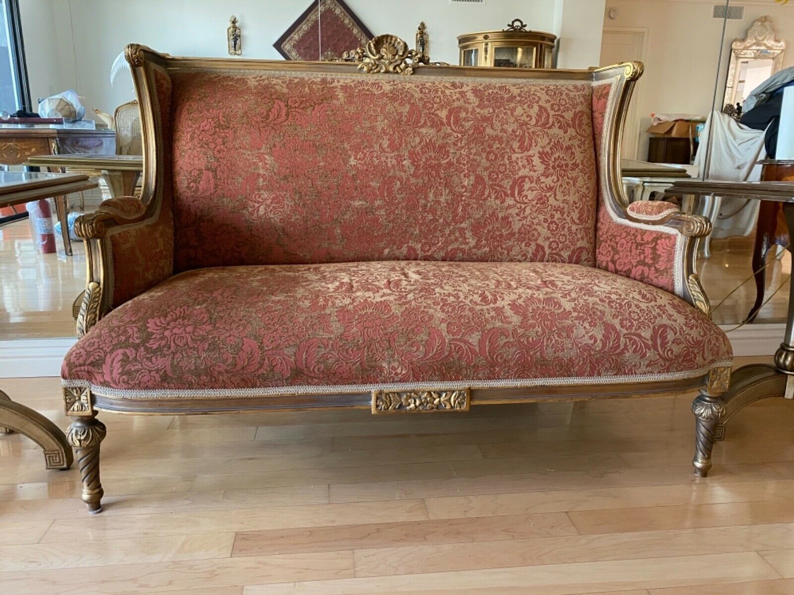 Red and gold couch. No returns, no refunds and no exchanges. Couch dimensions: Length - 54.5" Width - 24.5" Height - 41.5”