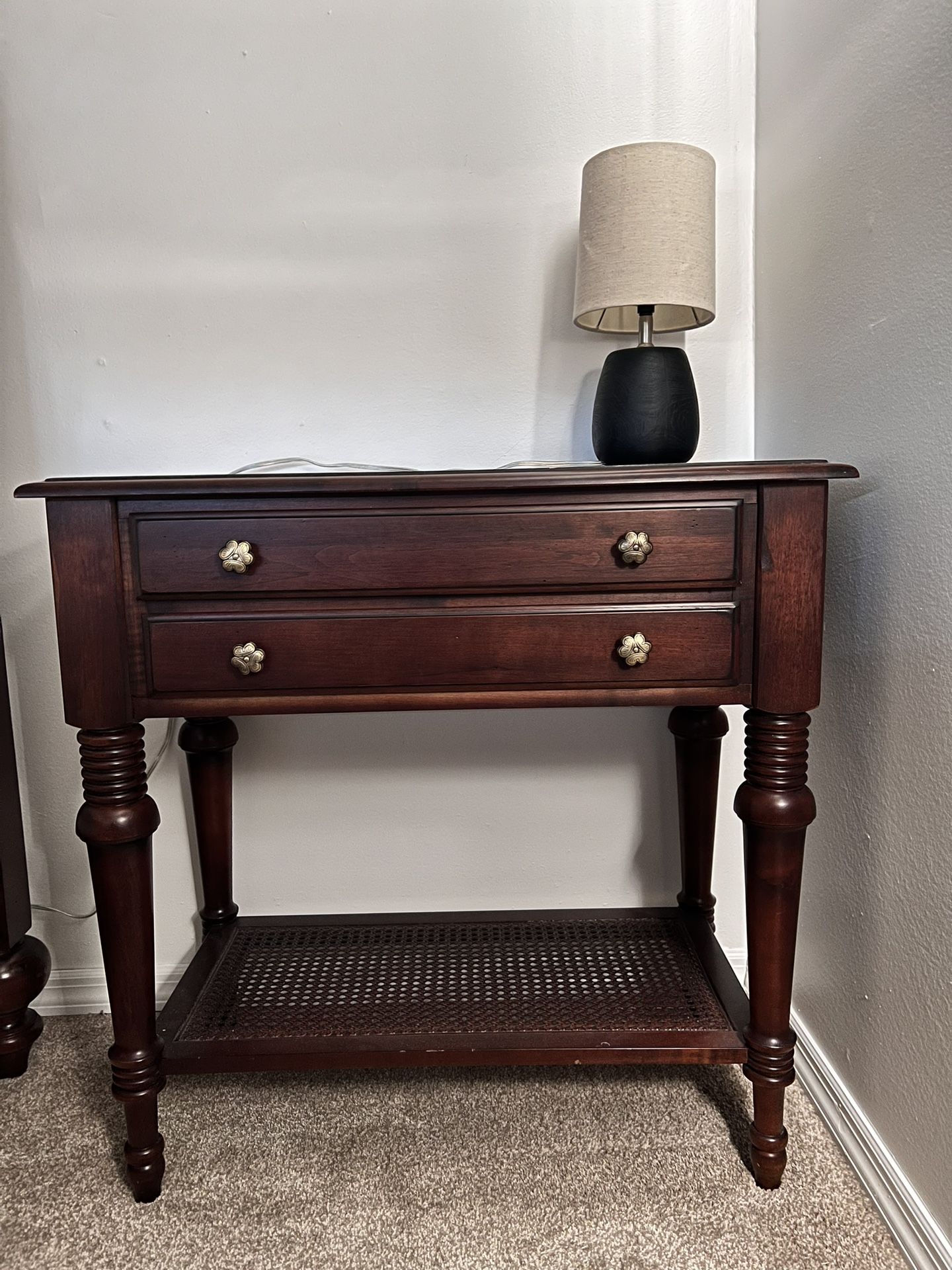 Medium-dark, reddish-brown, semi-transparent stain on maple. Antiqued; moderate edge, surface distressing. New cost $1500 https://offerup.com/redirect/?o=aHR0cHM6Ly93d3cuZXRoYW5hbGxlbi5jb20vZW5fVVMvc2hvcC1mdXJuaXR1cmUtYmVkcm9vbS1uaWdodC10YWJsZXMvY2F5bWFuLW5pZ2h0LXRhYmxlLzI5NTQwNl8yNzdIQi5odG1s