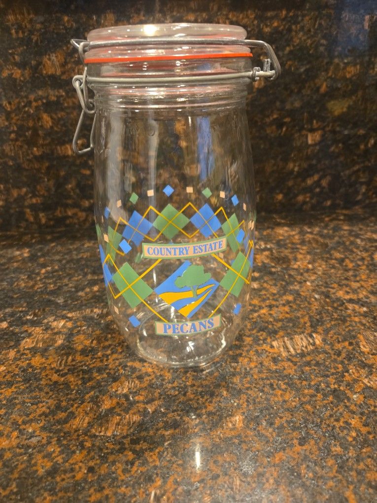 Nice glass storage jar with clamp lid and rubber seal. • 9 inches tall • Decorative Country Estate design • Great for kitchen storage Perfect for nuts, candy, cookies, or pantry items.