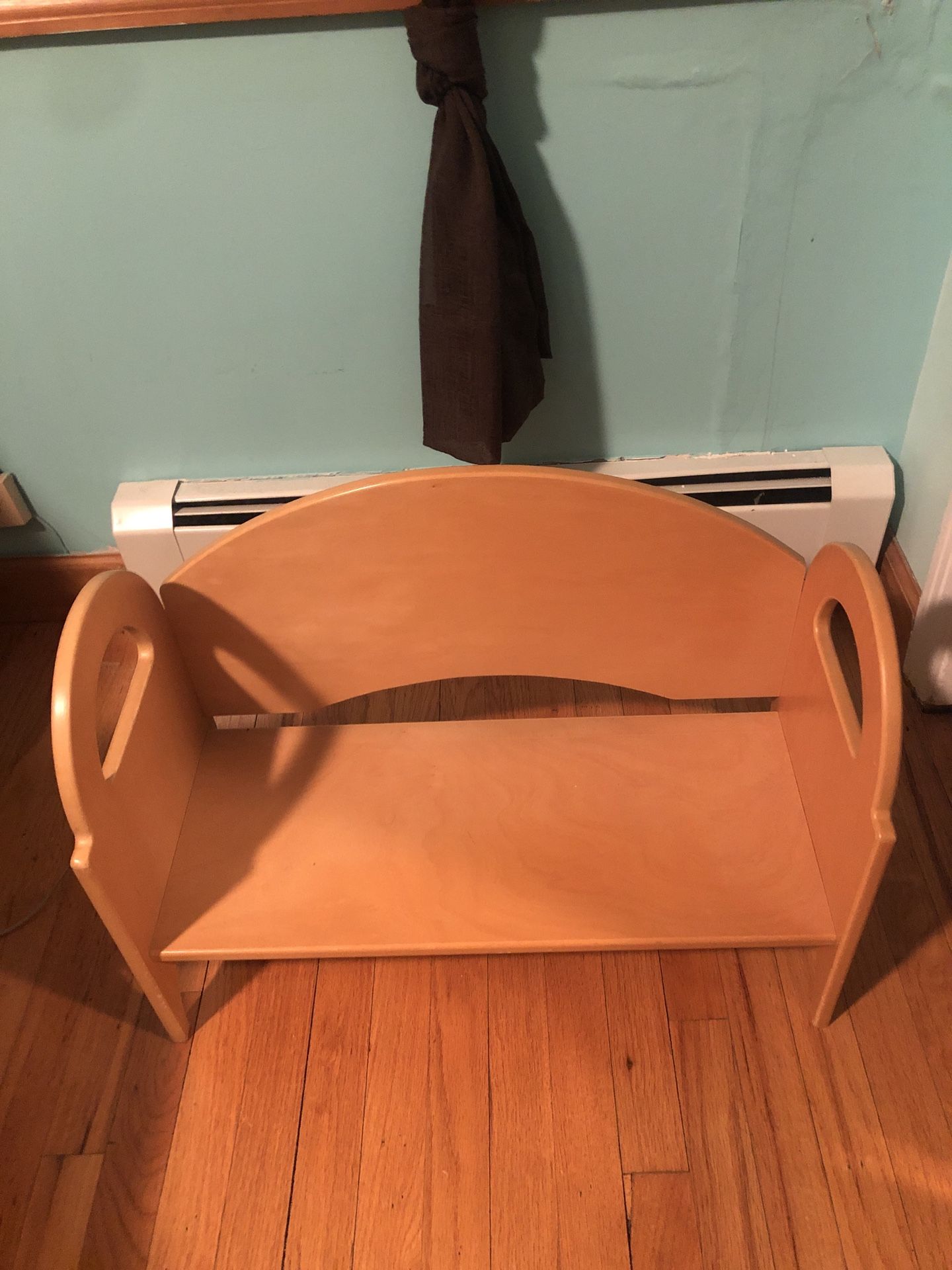 3 tier bookcase. Adjustable - 3 pieces can be removed and used as a bench. Perfect for kids room. Last picture shows stain on one shelf.