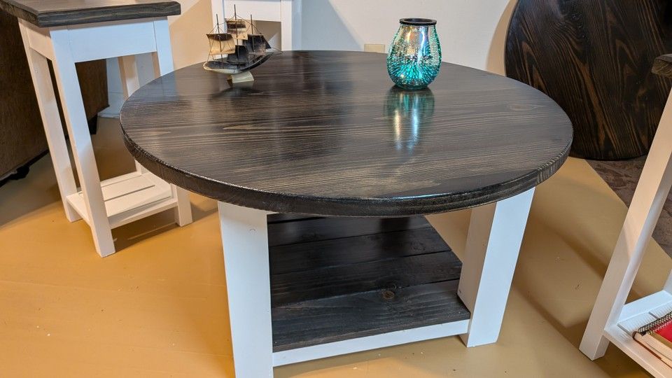 DON'T BUY CHEAP ! These are farmhouse style furniture built by hand. They are cedar & pine with Ebony stain & a tough Lacquer finish. The coffee table is 36" round by 20" tall with a bottom shelf. The end tables are 26" tall by 13. " Square also with a bottom shelf . I'm asking $500 for the set of 3. I will negotiate a little. You can order custom stain and sizes with 50% deposit! I am a local woodworker in Portsmouth.