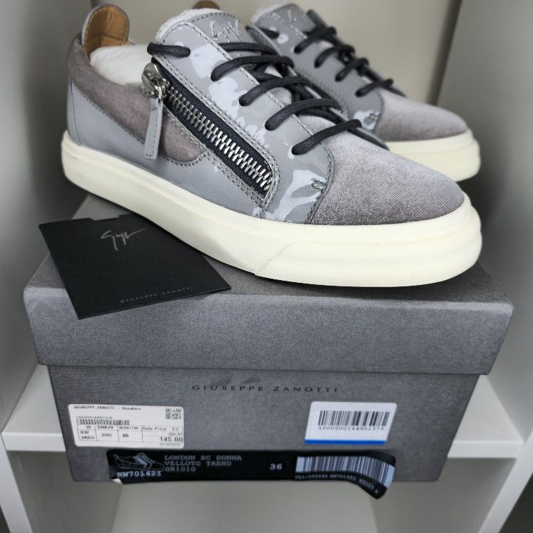 Giuseppe Zanotti Women's Double Side Zip Sneaker Suede Grey SIZE 36 New with Box and dustbag