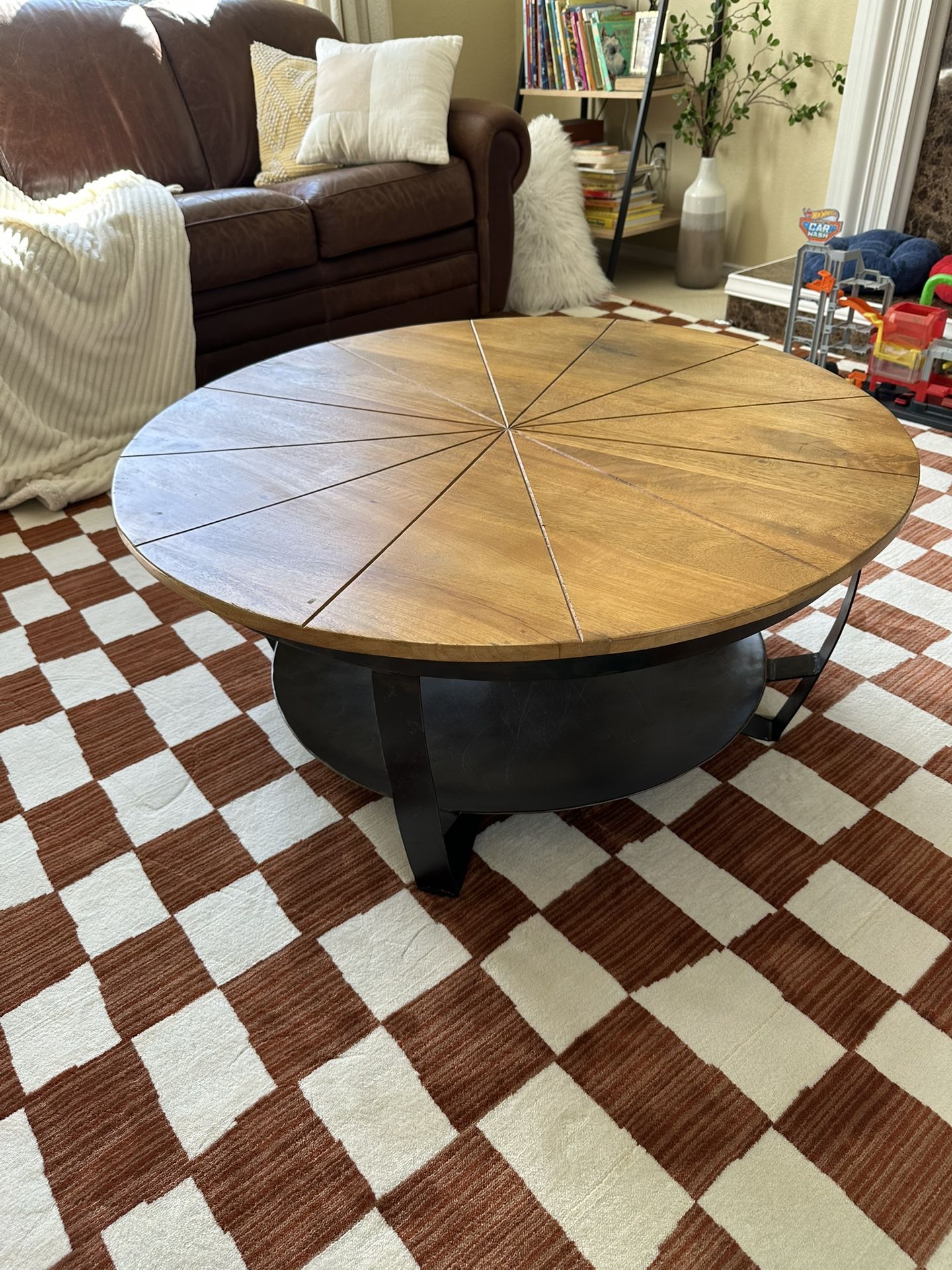 36” diameter, 16” tall. Wood top and black metal on the bottom. Normal wear and tear nicks.