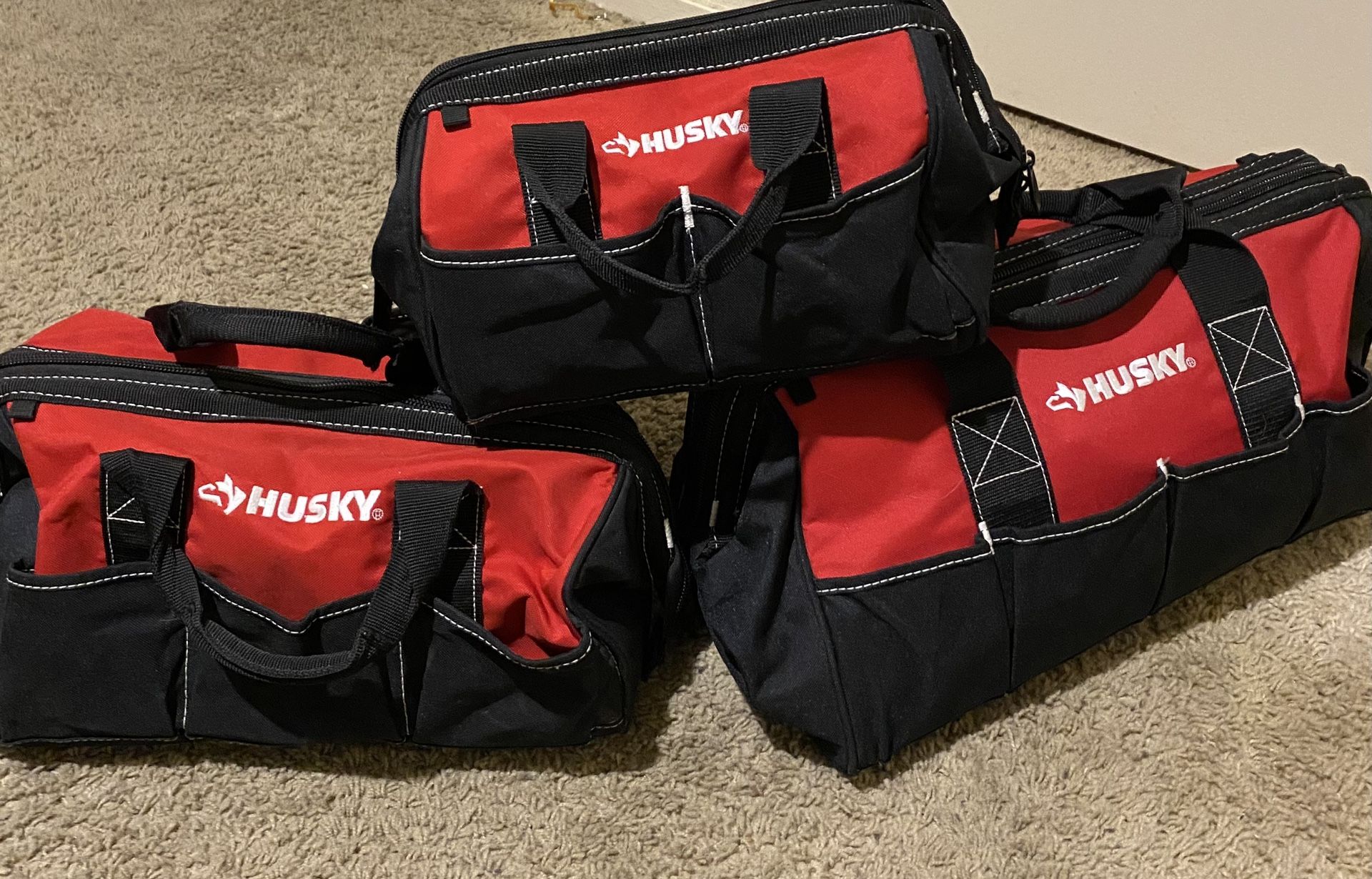 Husky 12 in tool bag 2 pockets Husky 15 in 5 pockets Husky 22 in 7 pockets Used only once 62$ MSRP
