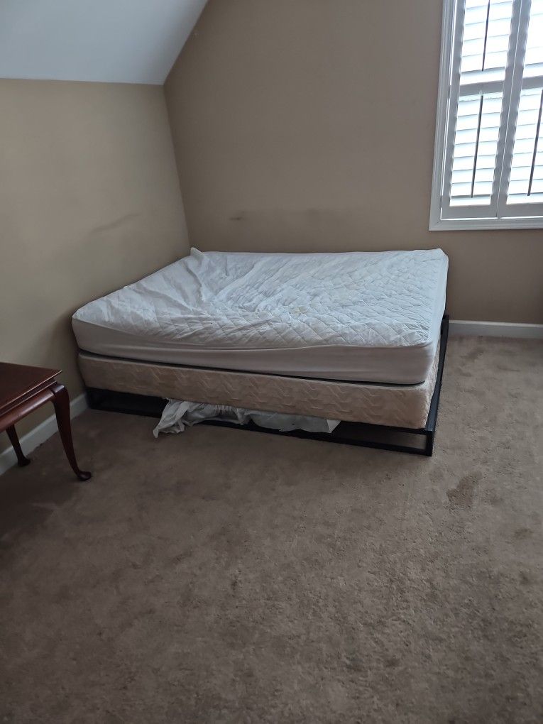 Queen Bed, Boxspring And Metal Frame, 2 Small Tables And A Folded Wooden Tray And A 65" TCL TV With HMDI Ports