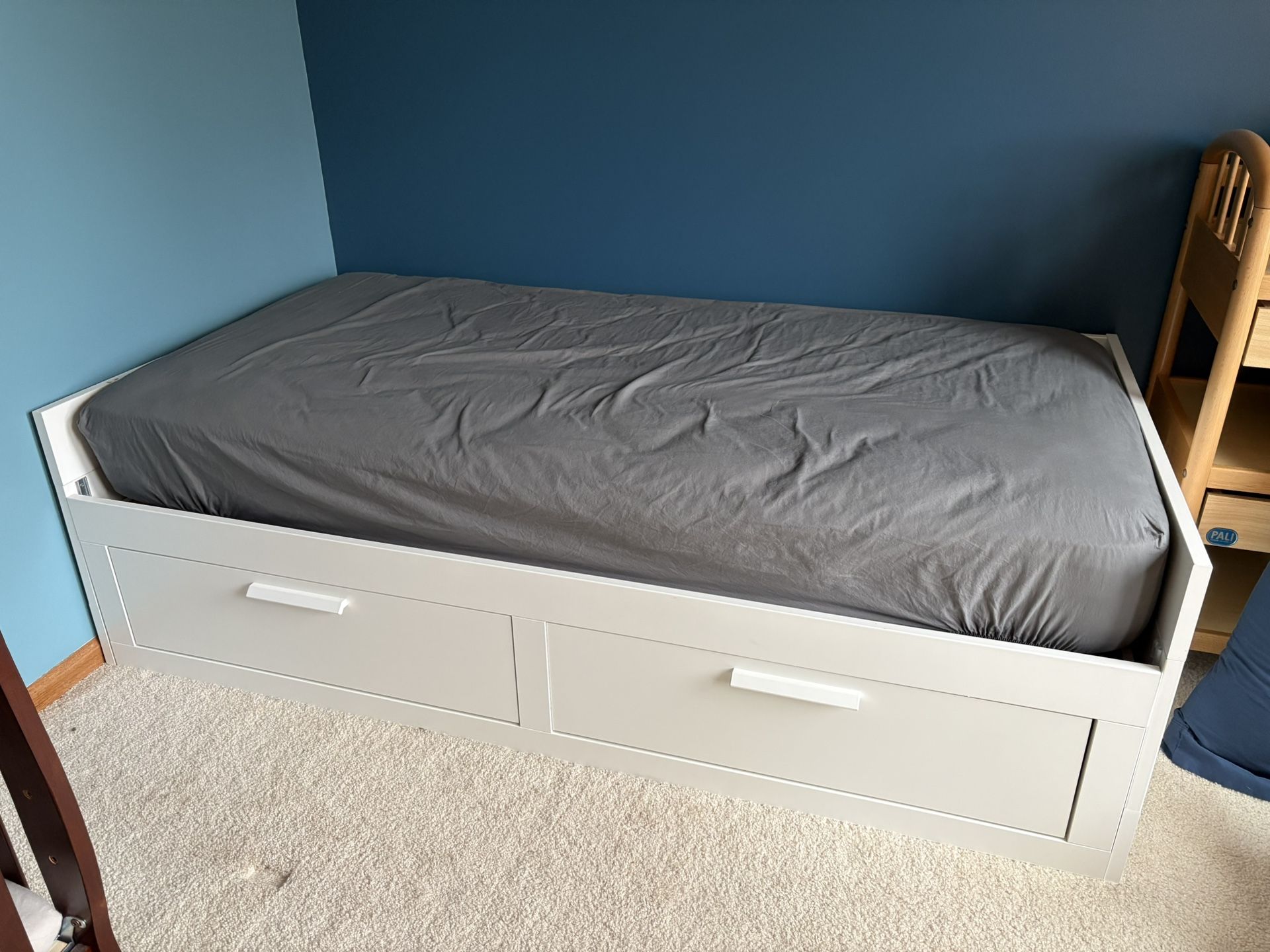 IKEA twin bed frame pulls out to convert to king bed. Two large storage drawers beneath. Dimensions in photos. Great guest bed solution! The frame is in good condition with just a few scrapes (pictured) Includes two twin IKEA mattresses similar to ones in the screenshot from ikea website. Asking $100. Retail value (new) is around $550. Smoke free home. We have dogs (of a non-shedding breed)
