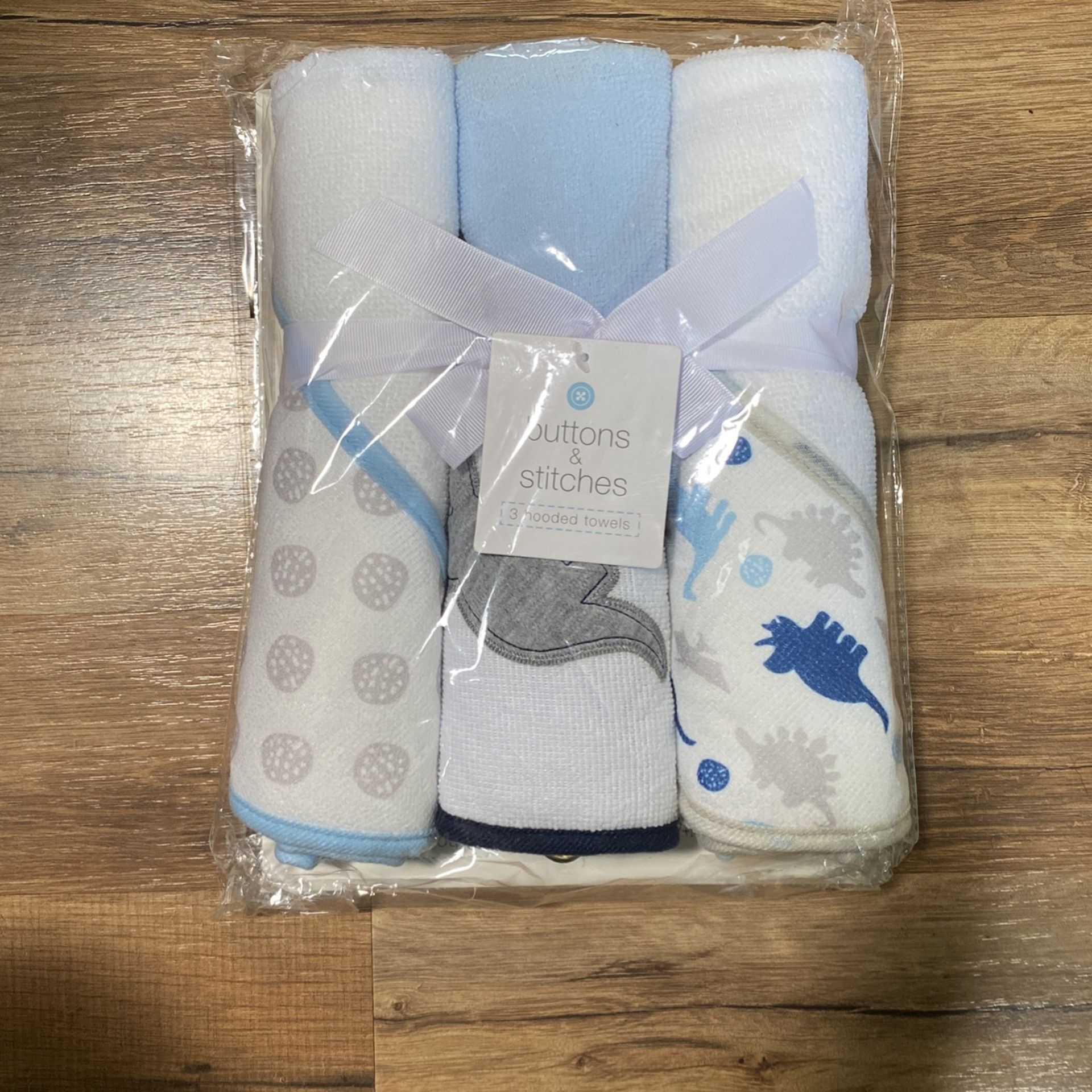 3 pack of new and unused hooded baby towels. Blue/white/grey color with dinosaur design.