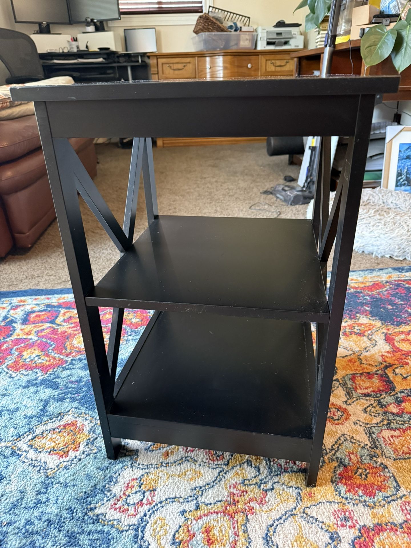 Small black table with shelf in it. Sturdy, good condition, 15 3/4” x 15 3/4” x 24” H