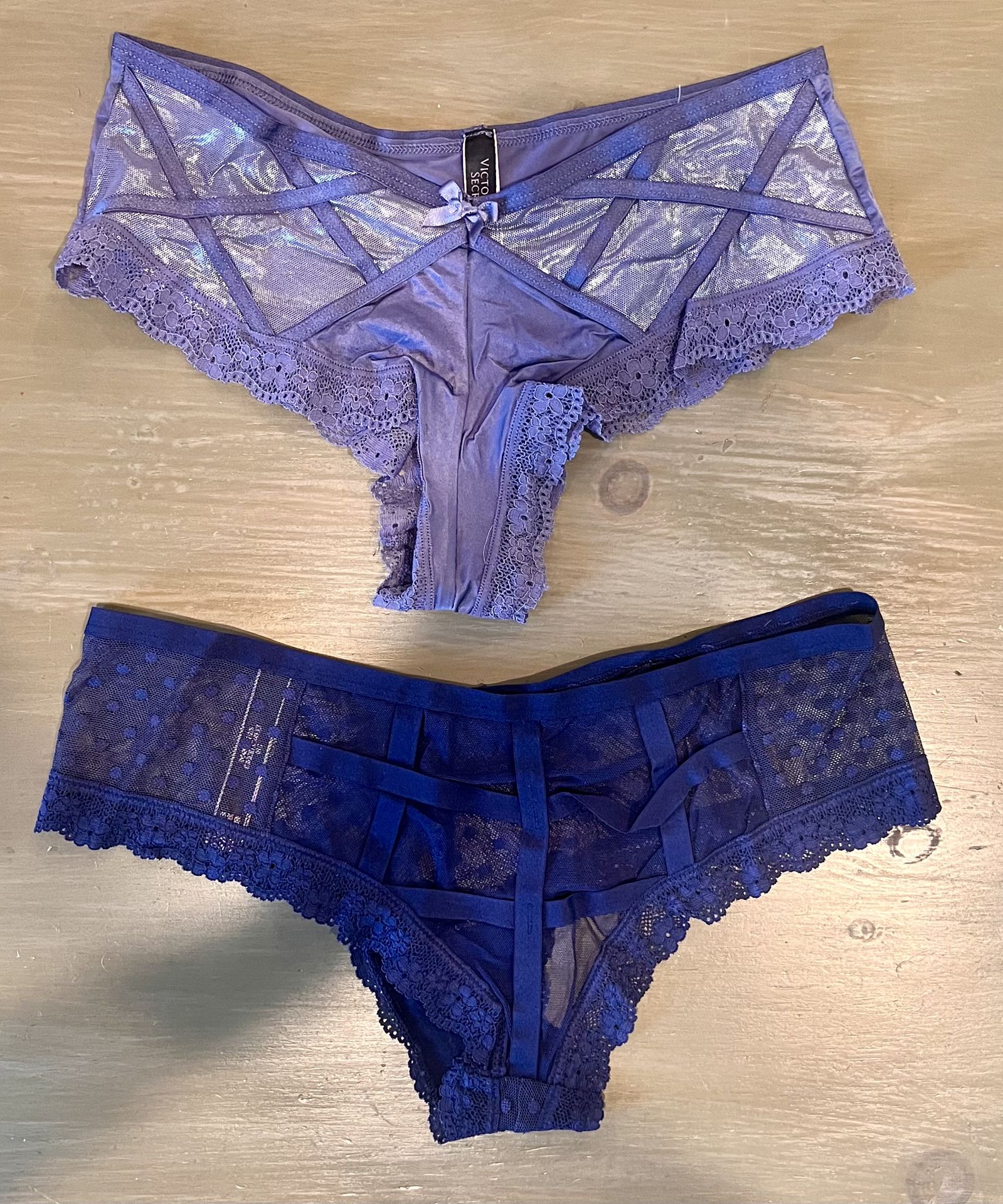 The product is for 4 pairs of Victoria's Secret Women's Medium Very Sexy Cheeky Panties with Lace Trim. These panties are designed for regular fit and feature a cheeky style with a lace trim. The burgundy , black, lavender, and navy color fabrics are machine washable and the compression area is focused around the waist. These panties are perfect for women looking for a comfortable and stylish intimates option.