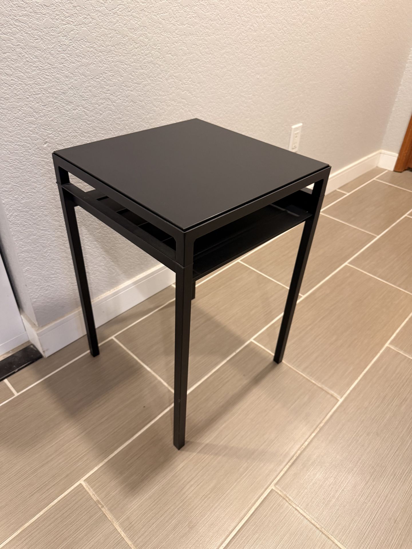 16x16 and 24 inches tall, this listing is for 2 identical tables. There is a storage section under the base, and the base plate is reversible (black or white top). Good condition, regular wear.