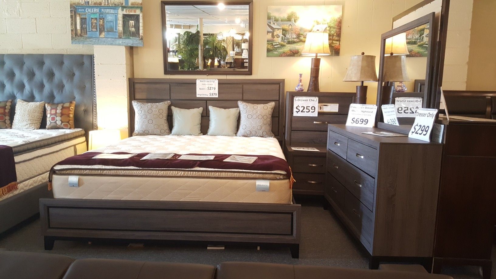 Brand new gray queen bed frame + dresser + mirror + nightstand