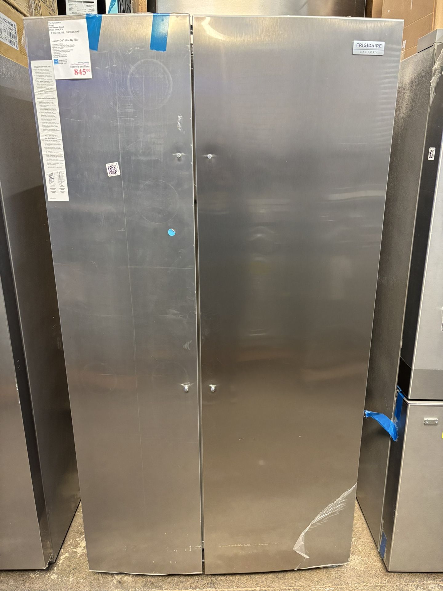 Delivery Available 1 Year Manufactures Warranty Scratch and Dent Model GRSN2620AF Frigidaire Gallery Refrigerator Gallery 36" Side By Side • Frigidaire Gallery • Impressive 26.0 Cu. Ft. Total Capacity • Internal Door-Edge Water Dispenser • Freezer Ice Maker • SpaceWise® Organization System • EvenTemp™ Cooling System • Deli Drawer • CrispSeal® Plus Crisper • Smudge-Proof® Finish Height: 69.875 Width: 36.125 Depth: 35.875