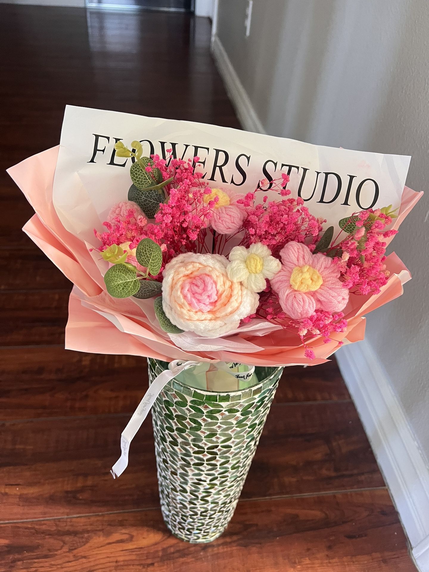 Handmade crochet flower bouquet 🌸 crafted from soft yarn – not fragile, no vase included. Comes with a matching gift bag, ready to be given as a present. ✨ Features: • Knitted crochet flowers (rose + daisy design) • Wrapped with premium paper & ribbon • Includes a stylish gift bag 🎁 • Lightweight & non-breakable • Approx. height: 11–12 in (28–30 cm) • Condition: Brand new 💡 Great for Valentine’s Day, Mother’s Day, birthdays, anniversaries, or home decor. ❗ Vase shown in photos is for display only, not included. 📦 Ships securely in a box with padding to keep bouquet in shape. This bouquet will be shipped in a medium box (12” x 9” x 6”) with protective bubble wrap and soft filler to keep its shape during transit. The flowers are lightweight and non-breakable (made from soft yarn), so they will arrive safely and ready to gift. Vase not included.