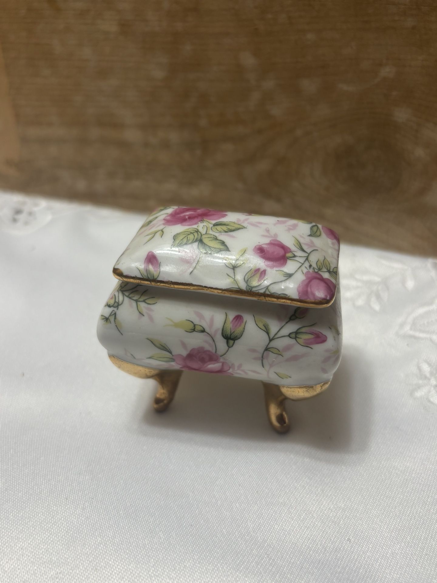 vintage, hand-painted porcelain trinket box with a pink rose pattern and gilded feet.