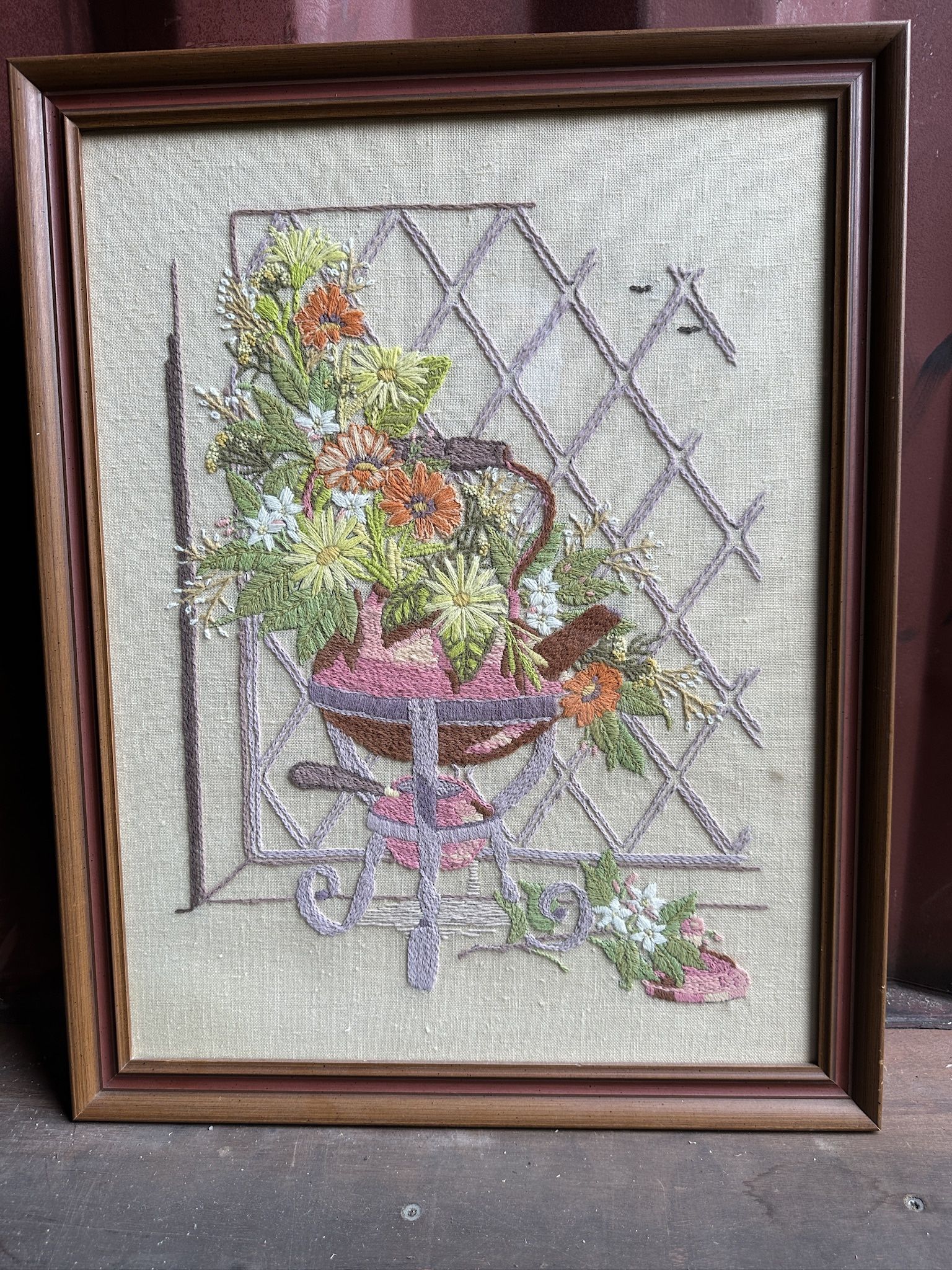 VINTAGE Custom Framed Embroidery w/ Flower Arranged in an Antique Tea Kettle