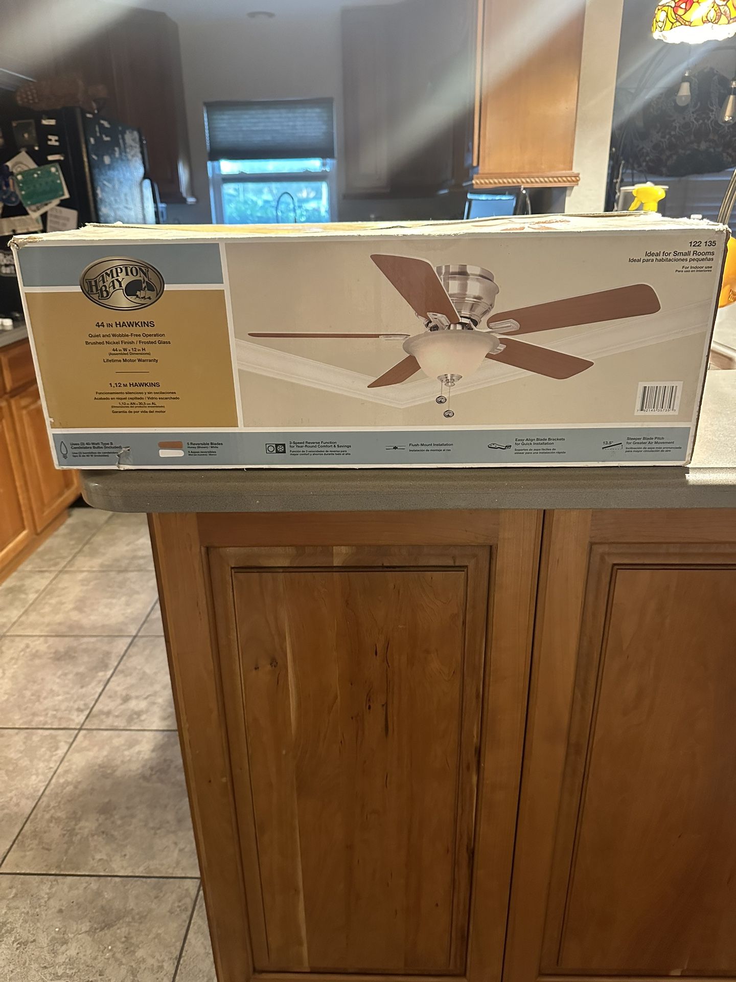 44”inch Hawkins Hampton Bay Ceiling Fan Brushed Nickel w/ Frosted Glass Fan blades can be Maple or Blanco Still in the box!