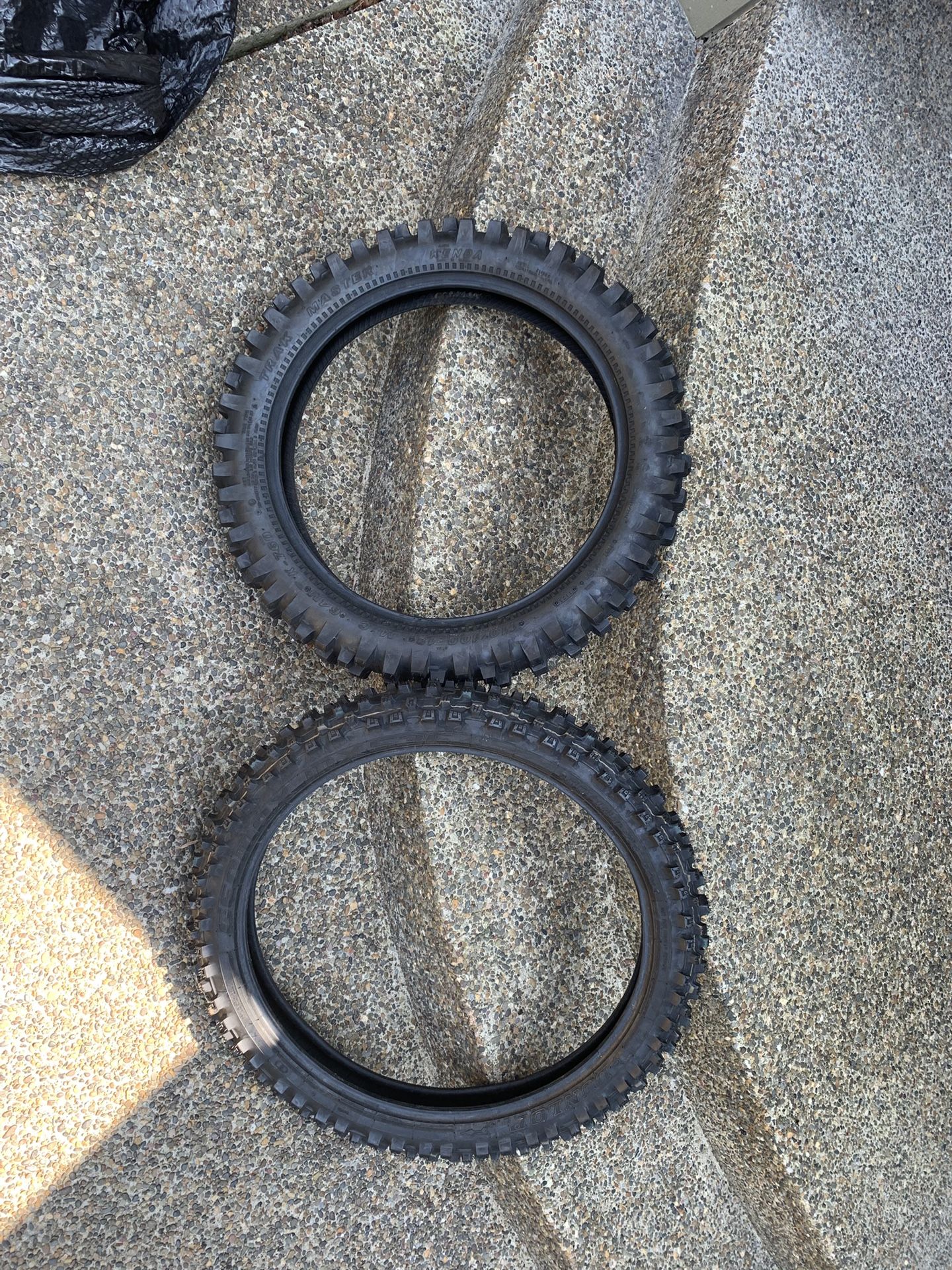 Two dirtbike tries unused bought for a bike I sold a while back. Rear tire Kenda 110/100 18” Front Tire Dunlop 80/100 21” Unused perfect shape ready to install.