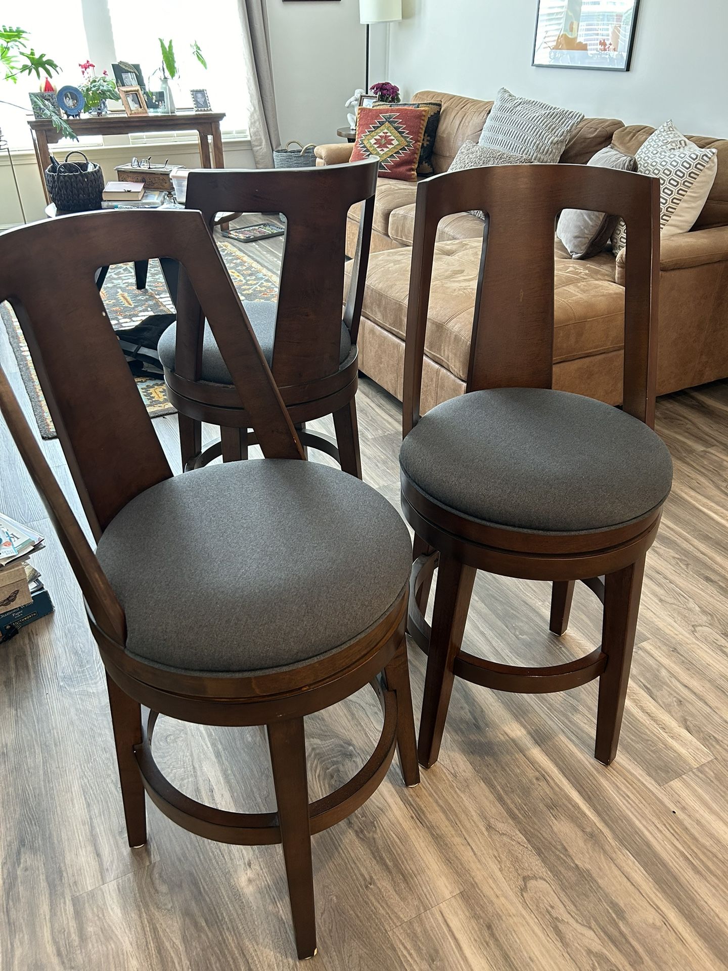 Beautiful pair of used rotating bar stools in good working condition. The third one has a stripped screw in one leg and is a little wobbly. While it DOES still function as a chair, im not sure for how long. So it comes free for parts or if you can repair Stools are 38 inches tall. The diameter of the seats are 18 inches. Buyer must pick up in Antioch, TN Cash is Preferred. I also accept Venmo or Zelle in person.