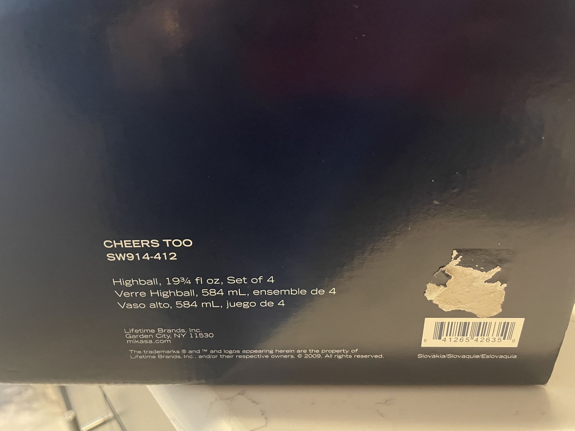 Set of 4 glasses price $30. Never used still in original packaging. Total qty available is 2 boxes total set of glass is 8.