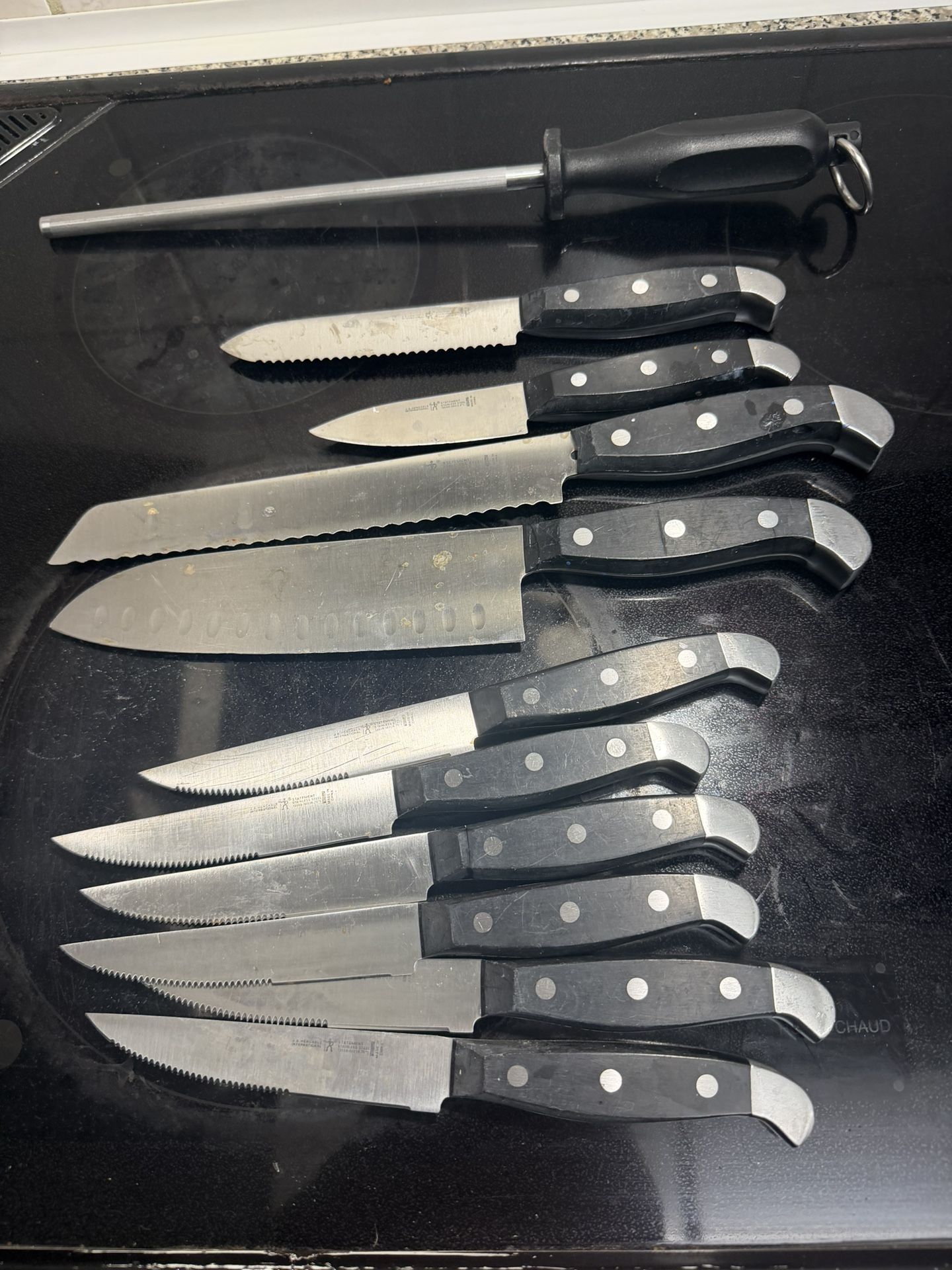 Description: Vintage Henckels “Ever Sharp” 10 piece knife set was purchased in 1984 while attending the Culinary Institute of America (CIA), Hyde Park, NY. Professionally used in culinary school, competitions, demonstrations, and professional kitchens. Known for durability, balance, and classic Henckels craftsmanship. Included 6 steak knives 1-8” rounded French knife 1-4”paring knife 1-10”bread, knife 1-5” serrated utility knife 1-14” sharpening steel Details: • Brand: Henckels • Line: Ever Sharp *. Ice h2o forged • Vintage (1984) • Made in Germany • Condition: Used, vintage (see photos) Normal wear from age and professional use. Photos are part of the description. Ships