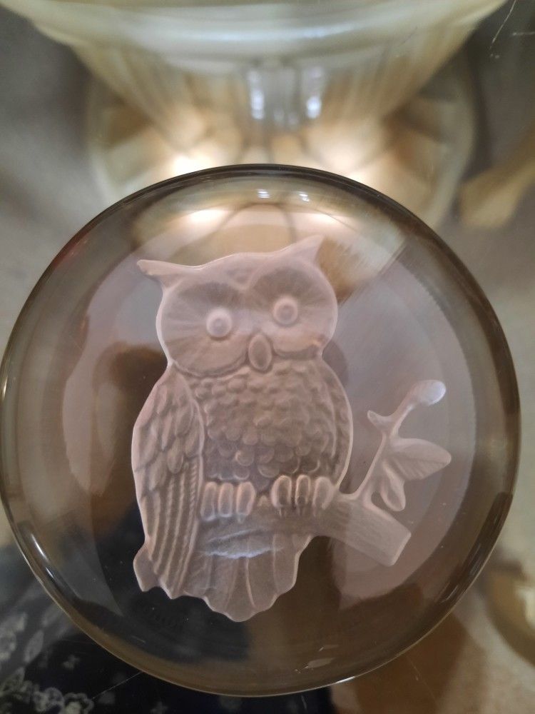 Vintage round glass paper with etched owl. Measures approximately 3.25"