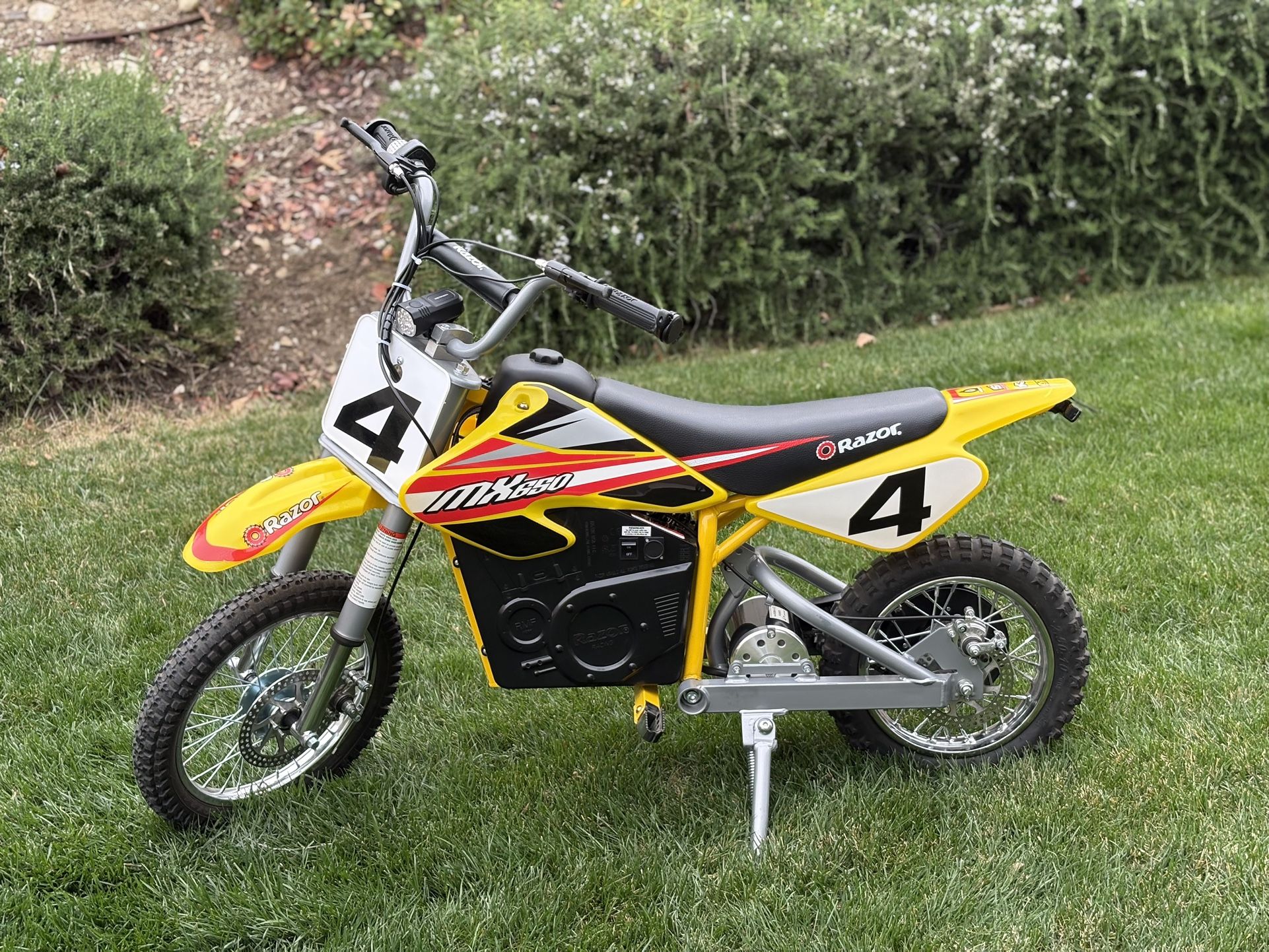 Here are the details: Razor MX 650 lightly used. Compact electric motocross bike with 650-watt electric motor. Kickstand: Retractable. Grips: Soft rubber. Carries riders at speeds of up to 17 mph; authentic dirt bike frame geometry. Dual suspension and riser handlebars deliver smooth, comfortable ride. Battery life Up to 40 mins. Pneumatic knobby tires for maximum power transfer; quiet variable-speed, chain-driven motor and Wheels- 16 inches front and 14 inches rear tires. Electrical system certified compliant with UL2272 by ACT Lab LLC, an accredited testing lab.