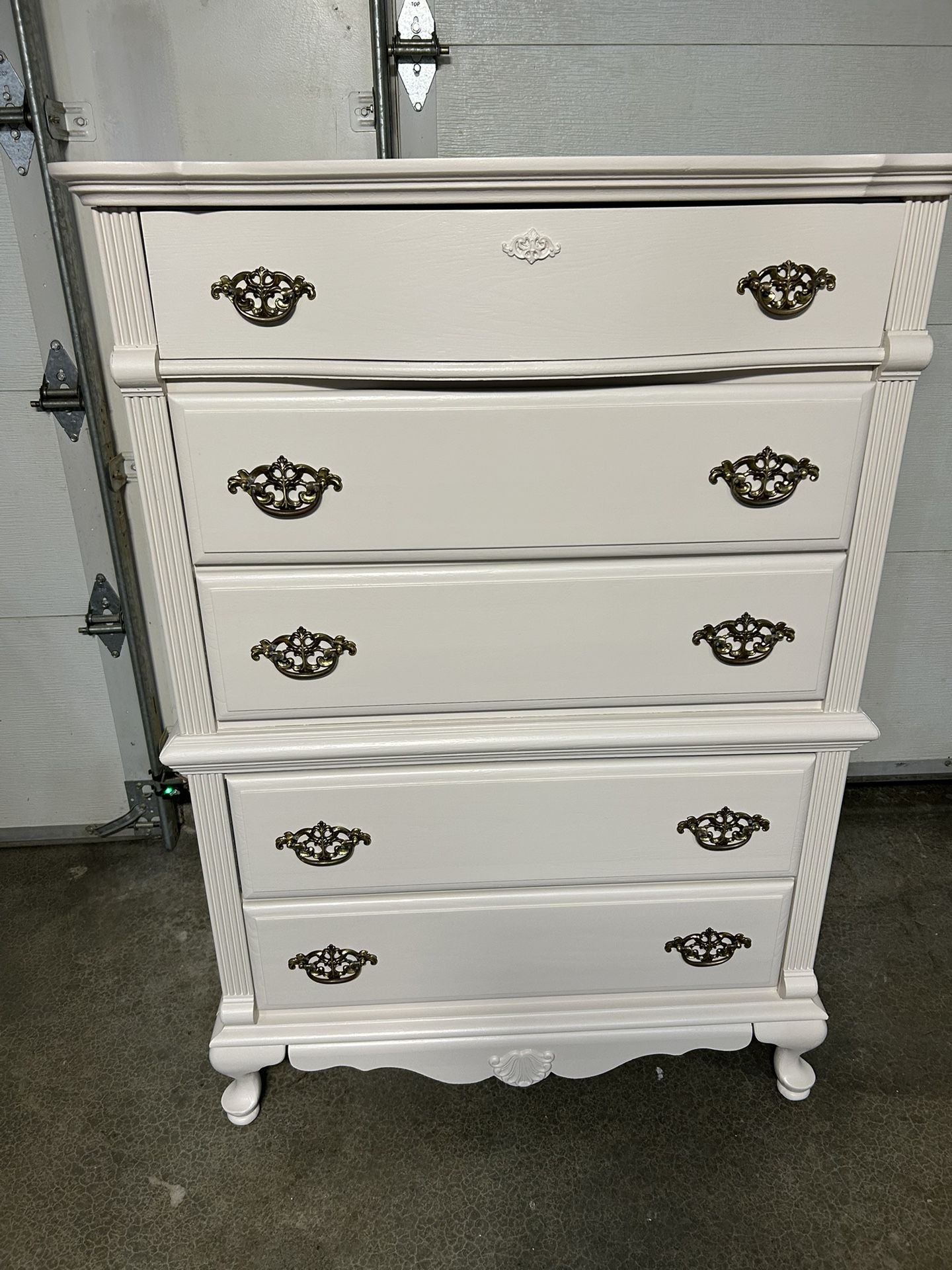 Solid wood and sturdy. Painted cream/off-white color. All drawers work and are clean with no smell. 38“ x 20“, 54 inches tall.