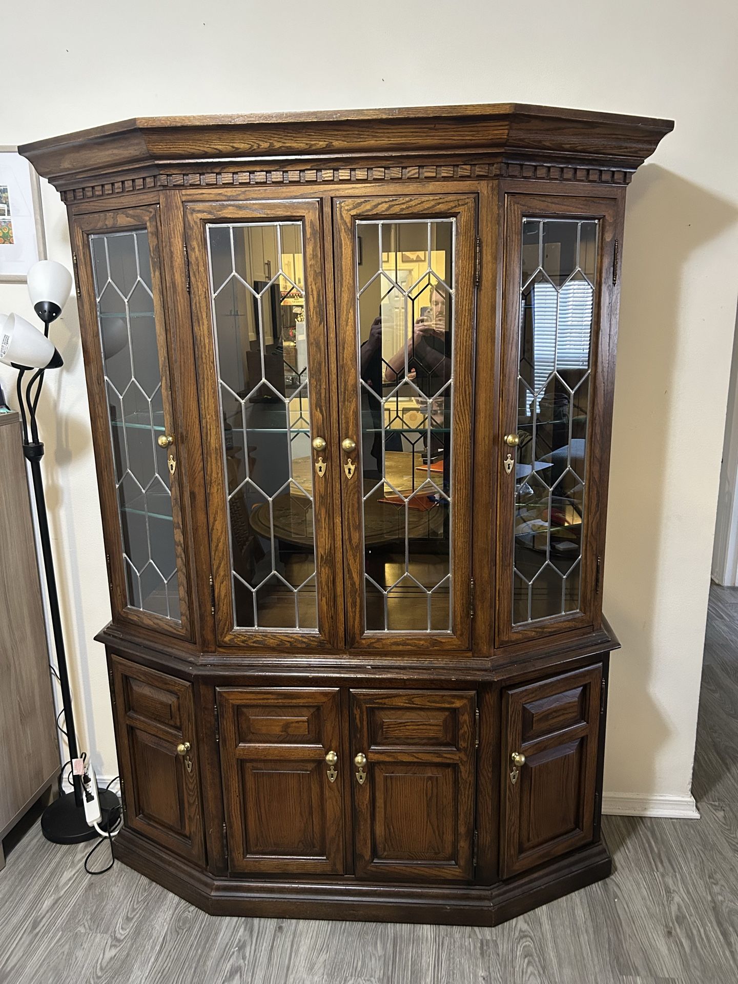 Beautiful antique solid wood China cabinet with decorative glass front doors and mirror backing. The cabinet separates into two parts that sit on top of each other for moving. Would look fantastic in a dining area, kitchen, hallway, or living area as is in great condition! Must pickup. Since it is solid wood it is heavy. Would recommend 3 people and a handcart/dolly for easy transport. Dimensions: total H: 82” W: 56” D: 20 1/8” Top: H: 52 1/4th” Bottom: H: ~30 1/4”
