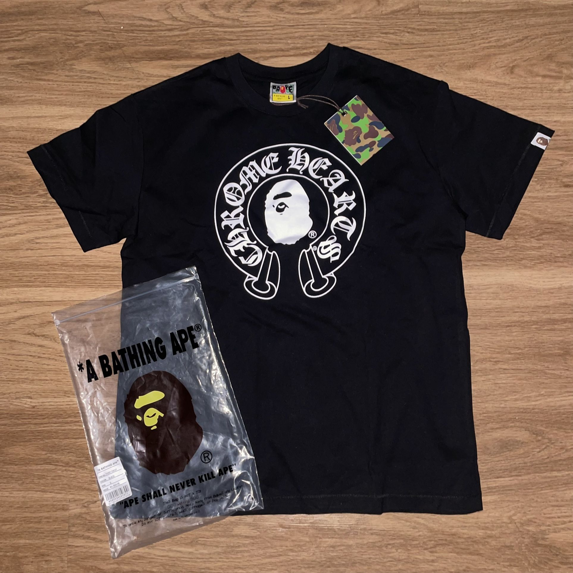 A crisp black collaboration tee blending BAPE’s playful Baby Milo graphics with Chrome Hearts’ gothic logo