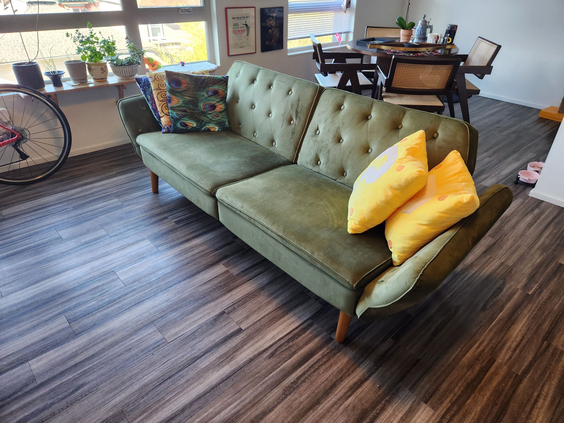 Located near Seattle U. Versatile green velvet futon sofa that converts into a bed. It has tufted back and arms, and wooden legs. The arms are a little wobbly.