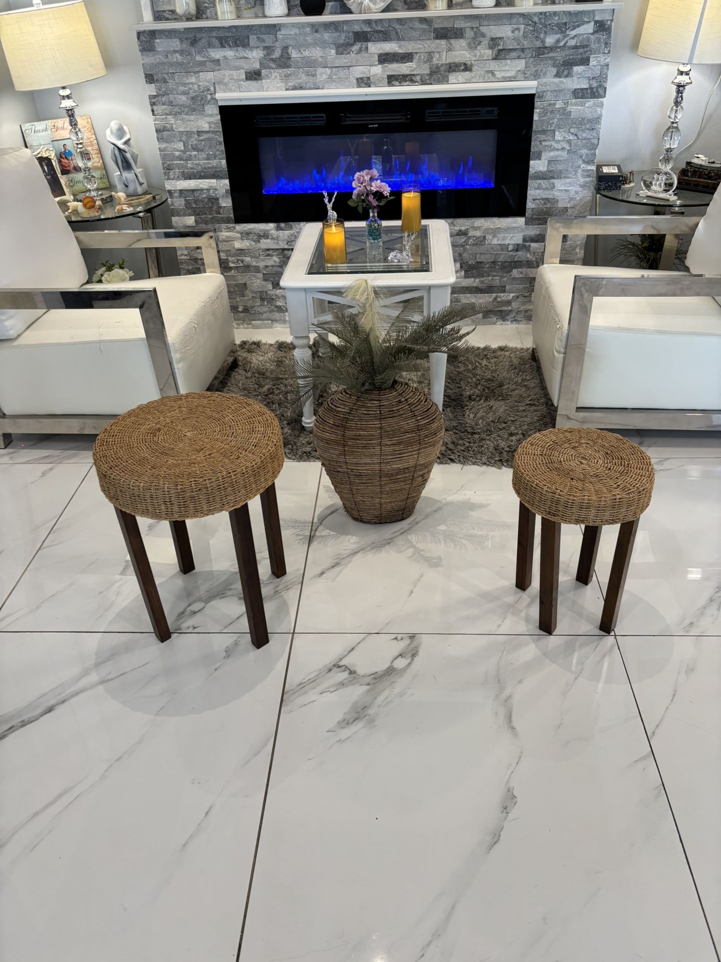 Enhance your living space with this matching set of two rattan side tables and a decorative woven floor basket. With their rounded tops and warm natural texture, these corner tables are both functional and stylish — ideal for accenting any room with a tropical, boho, or natural modern vibe. Set Includes: • 2 rattan top corner tables • One large, one smaller — great for layering or separate use • Solid wood legs, handwoven rattan tops • Lightweight yet sturdy • 1 decorative rattan floor basket • Comes with faux plant arrangement • Makes a beautiful centerpiece or corner filler Condition: Excellent – clean and ready to use Use Ideas: Great as nightstands, accent tables, entryway pieces, or patio décor Dimensions: Large: 16"w, 21"h Small: 12”w, 17”h