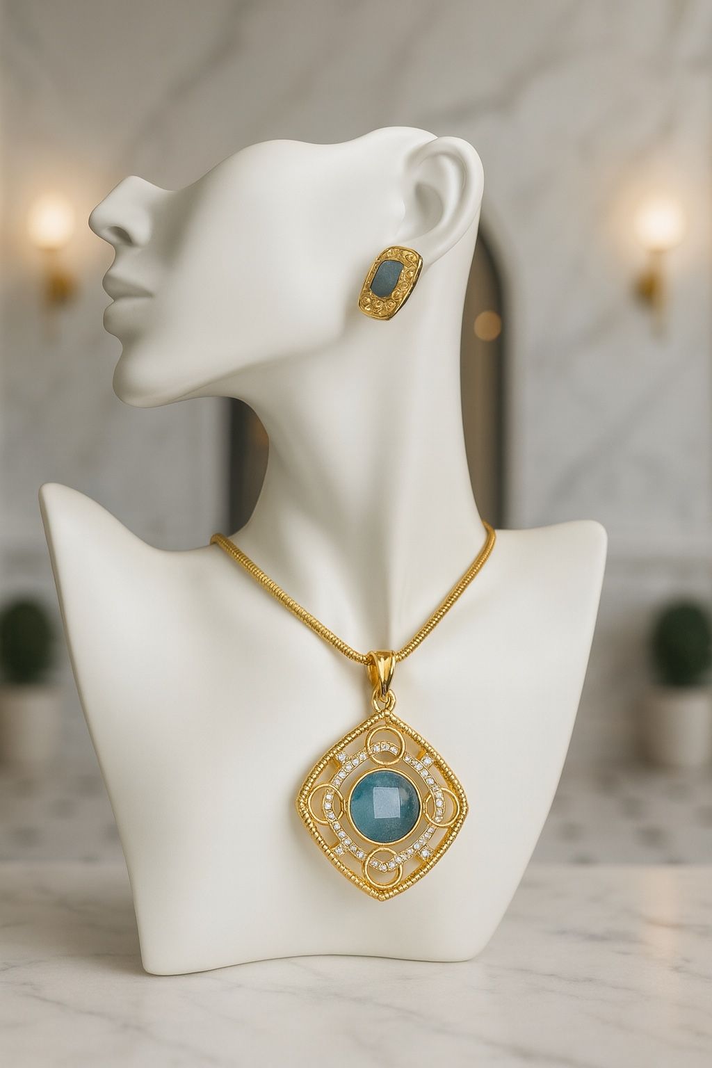 This exquisite jewelry set features a deep blue faceted gemstone framed in a beautifully detailed gold filigree design. The matching necklace and earrings embody sophistication and vintage charm, making them the perfect accessory for formal events, elegant dinners, or boutique-style fashion looks.