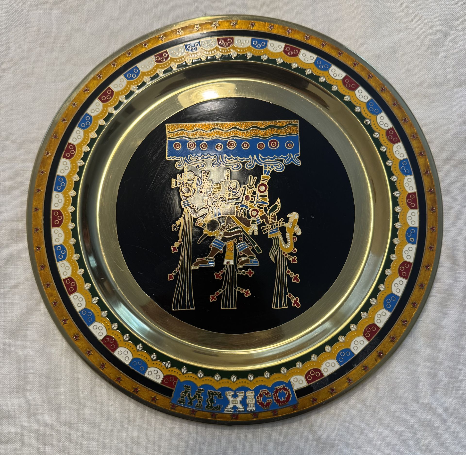 Vintage Metal Gold Hand Painted Mexico Decorative Art Plate