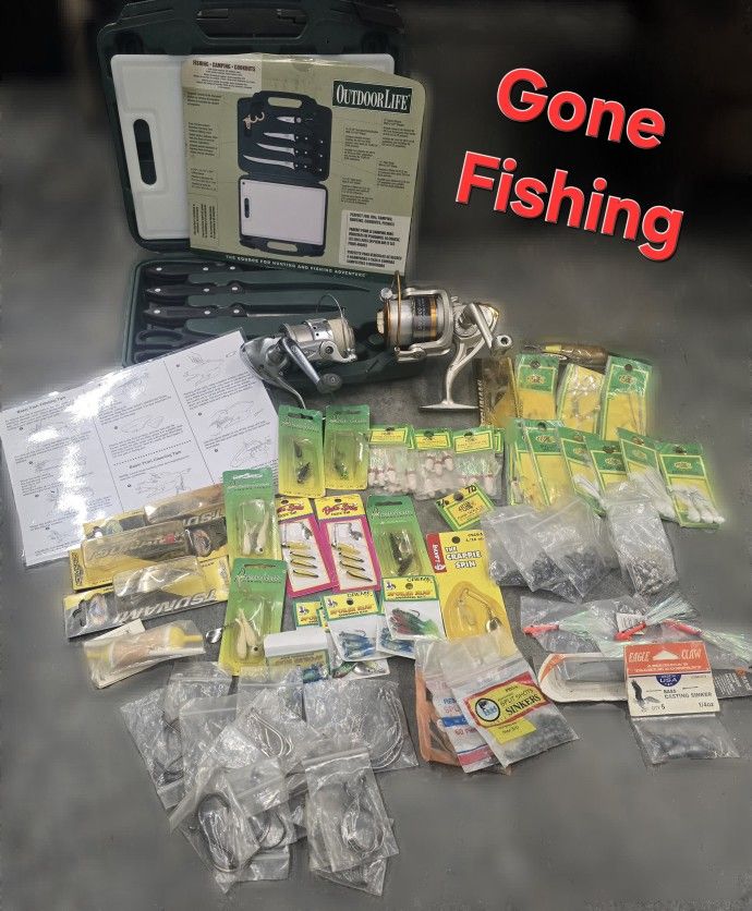 Just what you need for your next fishing trip. Outdoors Life Hunting knife set for wild game, fish, and fowl. With a butchering knife, cleaver, utility knife with cutting board, and a how-to guide. Along with hooks, weighs, spiders, Spooner, and many other things. To add it off, 2 reels a Quantum BSP80PT and a Fisheryhouse SW7000. All yours for $50