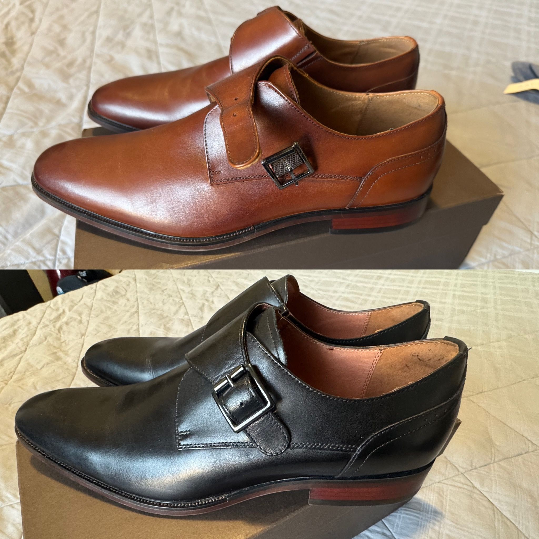 Men’s size 11.5 Florsheim single monk straps. Black and Cognac. Both pair purchased by and worn once by me. No scratches or blems. Serious inquiries please. In new condition. $75 each or $145 for both.