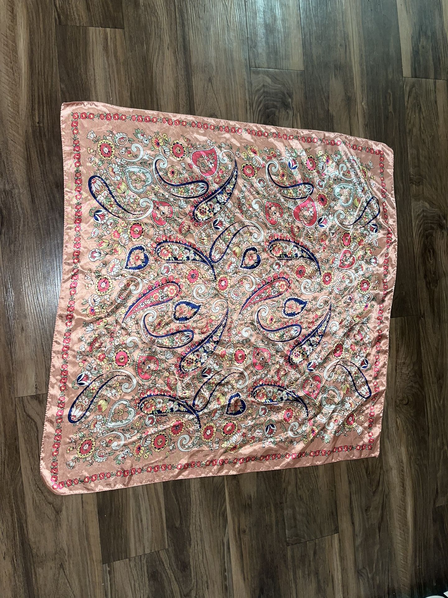 This is a large pink paisley scarf/bandana or head scarf. It’s very pretty and silky soft. It’s 35 inches by 35 inches and very versatile
