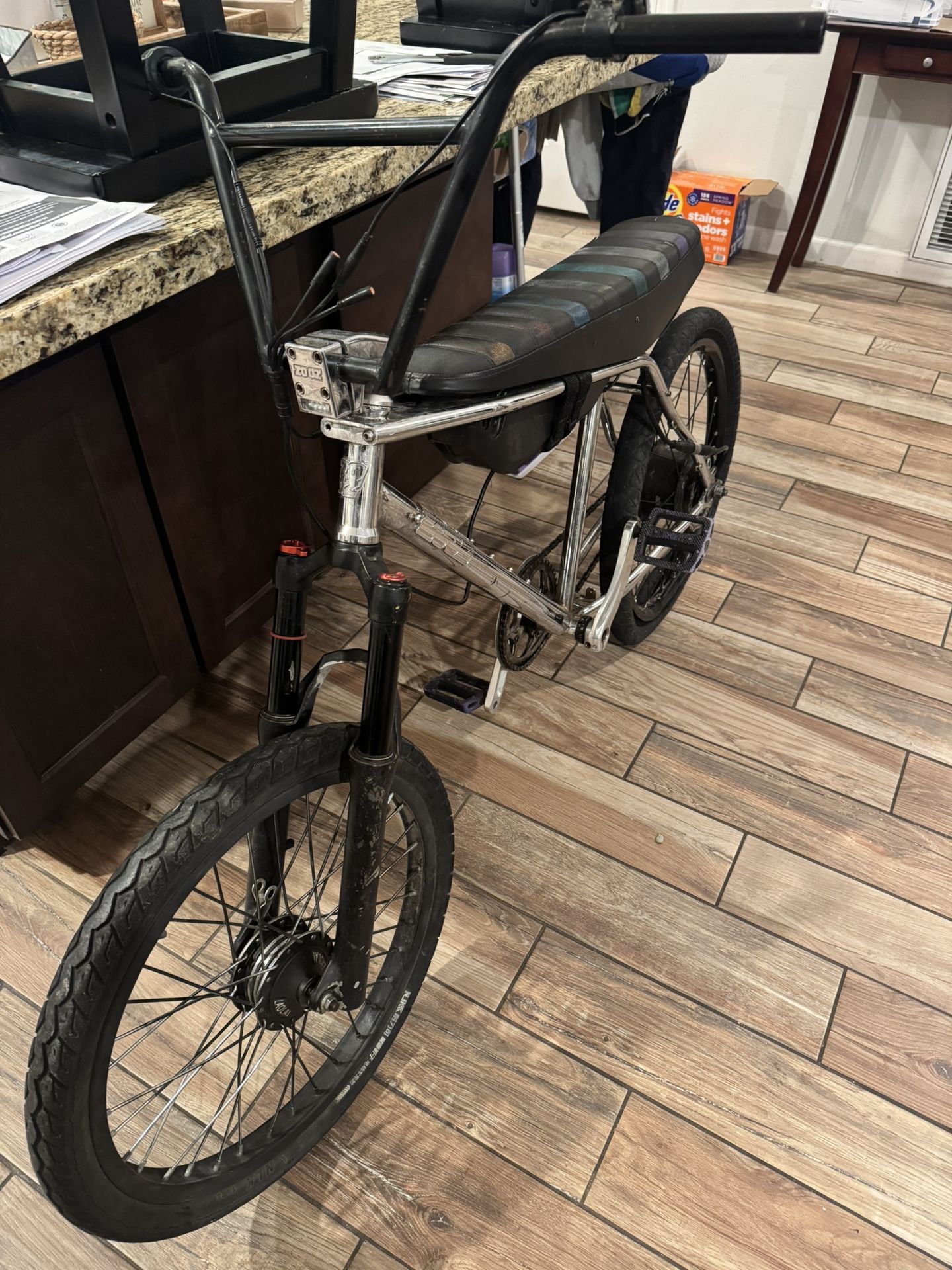 Bought it off a guy on marketplace with the intention to fix it and flip it. I’ve been busy with school and haven’t had time to work on it. It’s been sitting in my garage for the past month. Needs a new rear tube, and five spokes in the back. Will throw in a new rear hydraulic brake. Batteries busted but the bike works just fine, if you have any questions feel free to ask (650 obo)