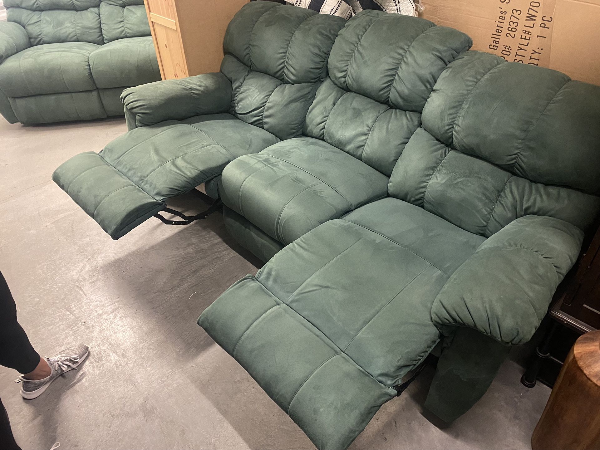 Fairly new - - love seat and couch / push button for reclining . Love seat 5ft long and couch 7ft . Color - light forest green