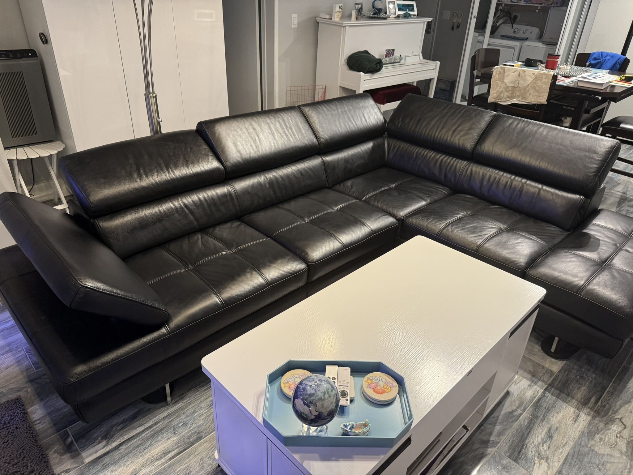Up for sale is a high-quality, large genuine leather sectional. This piece is incredibly comfortable and has been meticulously cared for and covered in a smoke-free home. Condition: • 10/10 condition. • No rips, tears, or stains. • Leather is soft, supple, and has no cracking. • Cushions are firm and have not sagged. Dimensions: • Overall: 113 inches x 89 inches • Depth: 42 inches Details: • Material: 100% Genuine Leather (Not faux or bonded leather). • Color: Black • Configuration: Left-hand facing Lowball offers will be ignored. This is a high-end piece of furniture in like-new condition. Location & Pickup: Must be able to pick up in downtown Long Beach. Please bring a truck and a second person to help with loading, as this is bulky piece.