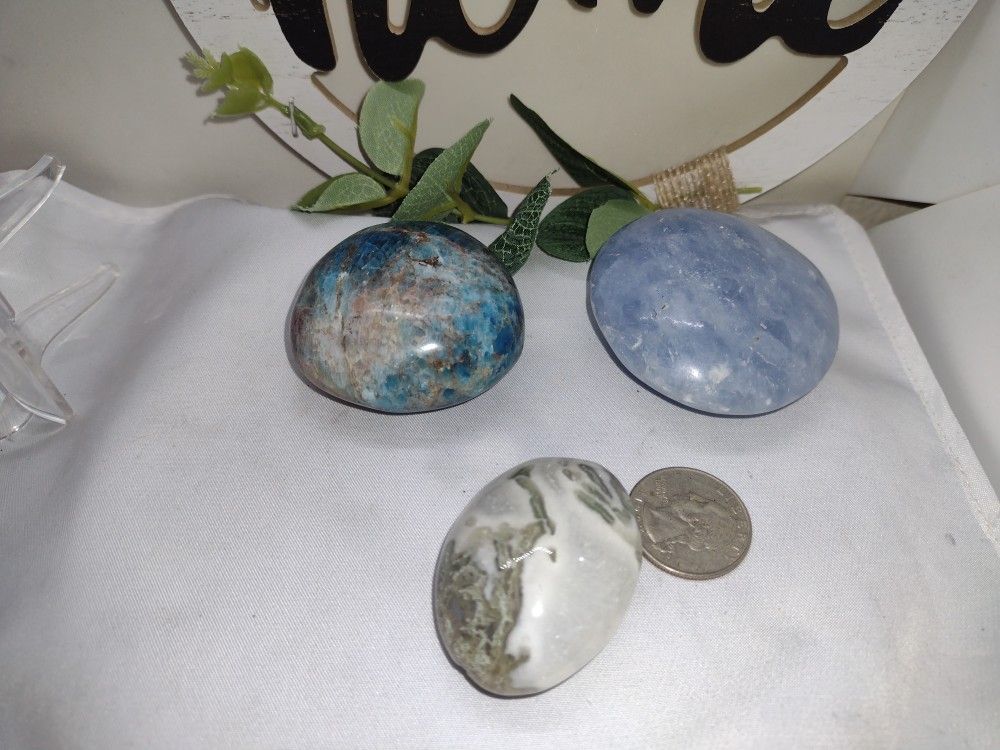Blue Apatite,Blue Calcite And Moss Agate Palm Stones