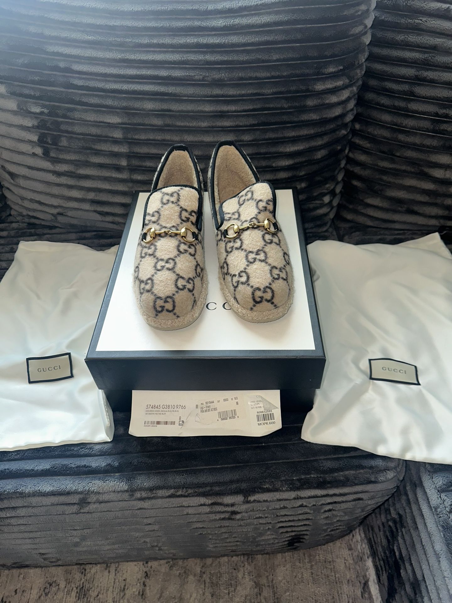 Gucci Fria Horsebit Size 8 Beige/Black Wool GG Slip On Loafers worn once for photoshoot never put on again. Comes with 2 dust bags. Excellent condition 9.5/10
