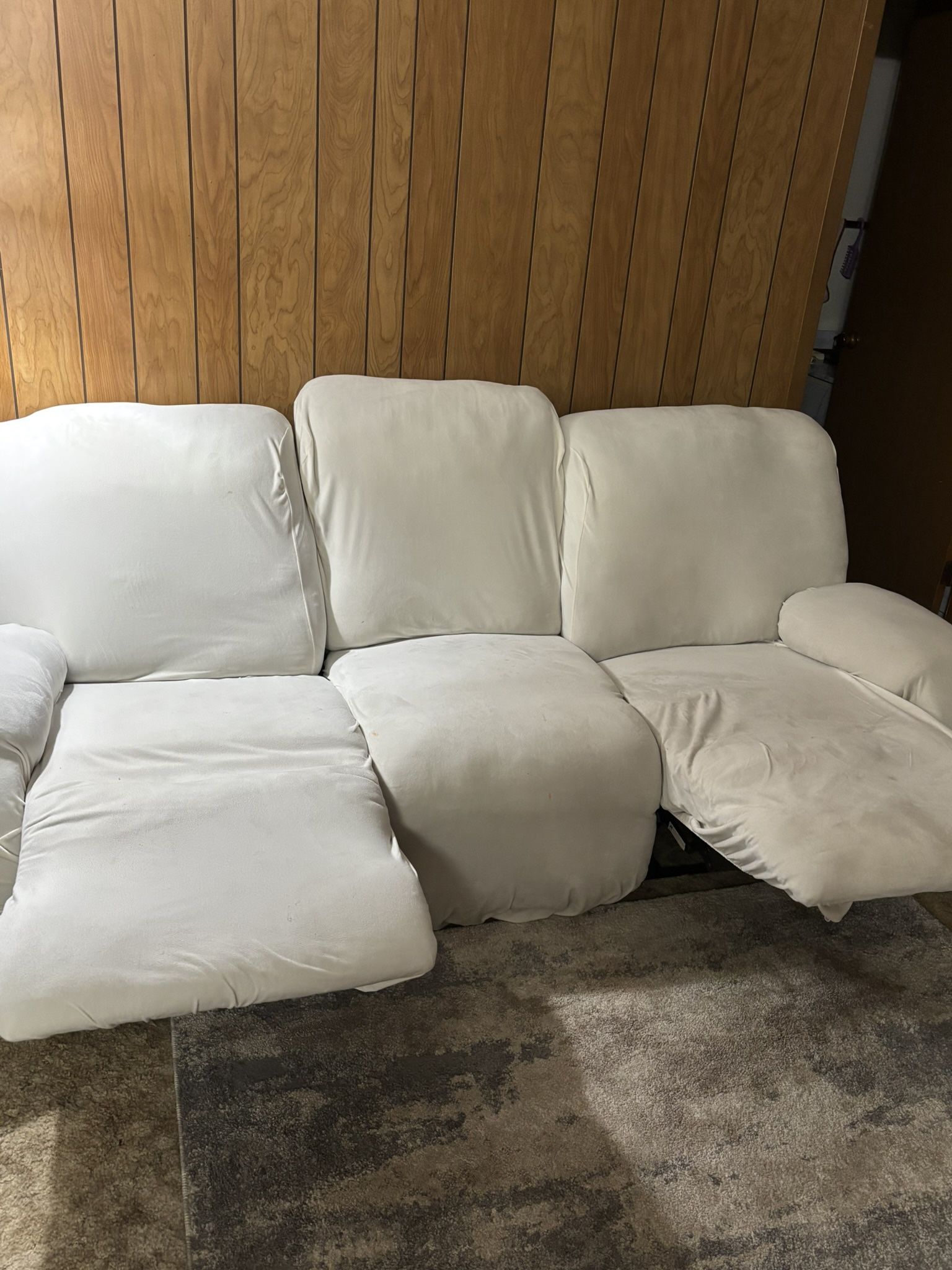 Recliner couch for sale. Both sides of the couch reclines, original cover gray comes with beige couch covers.