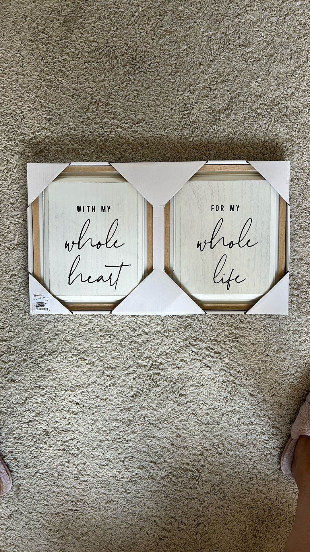 Brand new, never used set of two framed wall art pieces. Features the romantic quote split between both pieces: • “With my whole heart” • “For my whole life” Perfect for bridal gift, bedroom, living room, or entryway. Neutral tones and wood frame give it a cozy, farmhouse feel. Still in original packaging.