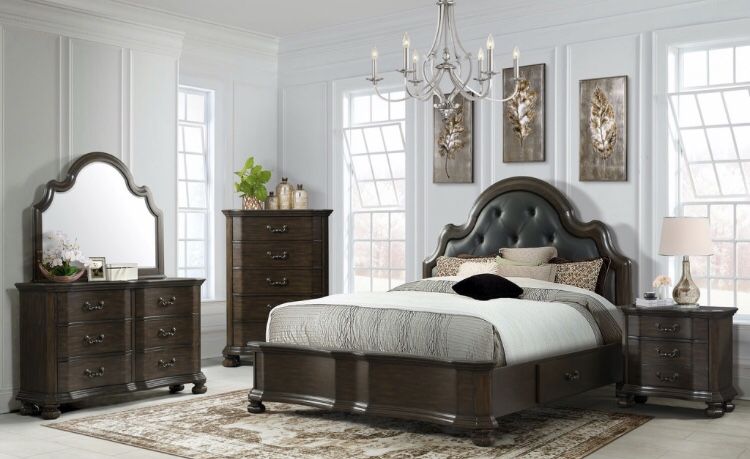 ****HOLIDAY SAVINGS**** Brand New 4 Piece Bedroom Set Only $1399 Was $2499 Set Includes: Queen Bed, Nightstand, Dresser & Mirror Mattress & Chest Sold Separately Rich Walnut Finish Upholstered Headboard Shaped Case Fronts Hidden Storage & USB Port in Nightstand Felt Lined Top Drawers Button Tufted Upholstered Headboard Storage Side Rails Perfect for a beautiful upgrade in your bedroom. Hablamos Español Our Locations Are Open & We Still Offer Delivery or Pick Up Order From The Comfort & Safety of Your Home Or Come Check Out Our Showrooms! Message Us To Order Today! All Floor Model’s Up To 50% Off!!!! INCREASE YOUR PURCHASING POWER!!! Easy Approval Credit Check Program w/ 6, 12, 18 & 24 Months Financing No Credit Check Financing Also Available. SAME AS CASH IF PAID OFF IN 90 DAYS!!! Come See Us @ One Of Our 2 Locations: Zoe’S Furniture in Richardson, TX. or Dallas, TX. ONLY!!! EL Avery CS