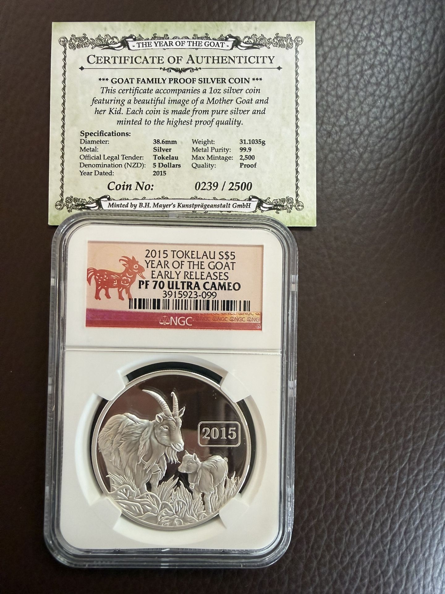 2015 1oz NGC PF70 ULTRA CAMEO TOKELAU YEAR OF THE GOAT SILVER COIN